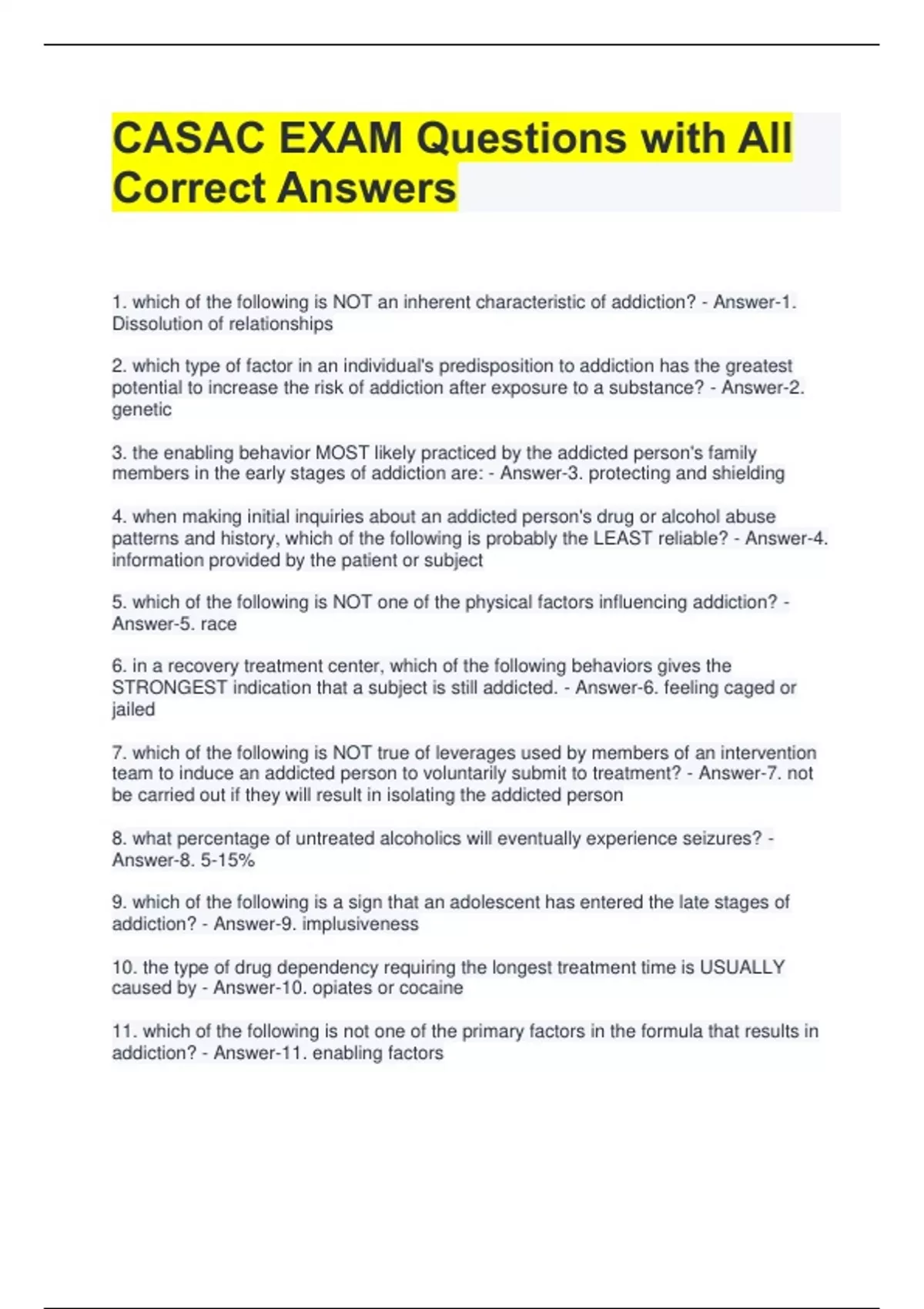 CASAC EXAM Questions with All Correct Answers 1. which of the following is NOT an inherent characteristic of addiction? - Answer-1. Dissolution of relationships 2. which type of factor in an individual's predisposition to addiction has the greatest potential to increase the risk of addiction after exposure to a substance? - Answer-2. genetic 3. the enabling behavior MOST likely practiced by the addicted person's family members in the early stages of addiction are: - Answer-3. protecting and shielding 4. when making initial inquiries about an addicted person's drug or alcohol abuse patterns and history, which of the following is probably the LEAST reliable? - Answer-4. information provided by the patient or subject 5. which of the following is NOT one of the physical factors influencing addiction? - Answer-5. race 6. in a recovery treatment center, which of the following behaviors gives the STRONGEST indication that a subject is still addicted. - Answer-6. feeling caged or jailed 7. which of the following is NOT true of leverages used by members of an intervention team to induce an addicted person to voluntarily submit to treatment? - Answer-7. not be carried out if they will result in isolating the addicted person 8. what percentage of untreated alcoholics will eventually experience seizures? - Answer-8. 5-15% 9. which of the following is a sign that an adolescent has entered the late stages of addiction? - Answer-9. implusiveness 10. the type of drug dependency requiring the longest treatment time is USUALLY caused by - Answer-10. opiates or cocaine 11. which of the following is not one of the primary factors in the formula that results in addiction? - Answer-11. enabling factors 12. drugs sometimes used in detoxification and which occupy person's opiate-receptor sites without creating an accompanying sense of euphoria or loss of consciousness are - Answer-12. agonists 13. the normalization process during the late recovery phase of treatment includes - Answer-13. stress reduction techniques 14. which of the following unconscious defense mechanism, used by an addicted person is characterized by partial awareness of the severity of the addiction? - Answer14. isolation 15. the characteristic of an addicted person's recovery illustrated by the person's attempt to repair the relationships damage by his/her addiction is - Answer-15. surrender 16. which of the following is a sign that a drinker has entered the late stages of alcoholism? - Answer-16. personality changes 17. an alcoholic subject is said to have entered stage four of the withdrawal process if he or she experiences - Answer-17. vomiting 18. which of the following unconscious defense mechanisms, used by an addicted person, is characterized by an avoidance of feelings through focusing on logic? - Answer-18. projection 19. measuring from the starting point of detoxification, what is typically the amount of time required for a recovering person to regain the level of health and well-being associated with his/her pre-addiction lifestyle? - Answer-19. 18 months 20. a characteristic that typically differentiates teenage alcoholism from adult alcoholism is that teenagers - Answer-20. are more likely to explain that they drink to celebrate or be sociable 21. which type of recovery treatment is reserved for the most advanced cases of addiction? - Answer-21. inpatient hospitalization 22. the use of which opiate drug typically carries the lowest risk for dependency or abuse? - Answer-22. methadone 23. what is the approximate mortatility rate for alcoholic patients who suffer from DTs - Answer-23. 1-10% 24. addiction is a process influenced primarily by each of the following except - Answer24. factors relating to specific physiological health concerns 25. which of the following statements about alcoholism is not true? - Answer-25. divorce, loss of a job, death of a loved one, and other life traumas can cause alcoholism 26. age, peers, and status are examples of ________ factors in an individual's predisposition to addiction - Answer-26. sociocultural 27. how many days should an alcoholic subjects detoxification process typically last? - Answer-27. 1-10 28. which of the following is NOT true of the confrontation that takes place between members of an intervention team and an addicted person? - Answer-28. involved quickthinking people who can formulate responses to unanticipated statements 29. what is characteristic of an addicted person's recovery illustrated by the person's expression of willingness to accept the help of treatment staff in the recovery process? - Answer-29. surrender 30. in the early stages of an addicted or alcoholic person's recovery, the process of nutritional repair should include each of the following except - Answer-30. increasing the amount of sugars in the diet 31. which of the following stages in the progression to freedom from addiction is considered to be the final stage, at which recovery is complete? - Answer-31. spiritual well-being 32. the first goal of recovery treatment is to remedy_____damage to the addicted person - Answer-32. physical