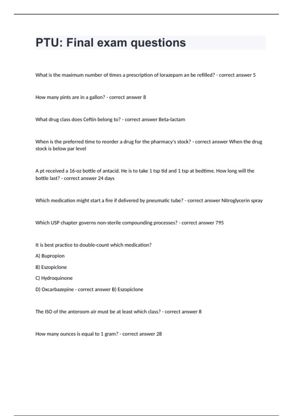 PTU: Final exam questionsWhat is the maximum number of times a prescription of lorazepam an be refilled? - correct answer 5 How many pints are in a gallon? - correct answer 8 What drug class does Ceftin belong to? - correct answer Beta-lactam When is the preferred time to reorder a drug for the pharmacy's stock? - correct answer When the drug stock is below par level A pt received a 16-oz bottle of antacid. He is to take 1 tsp tid and 1 tsp at bedtime. How long will the bottle last? - correct answer 24 days Which medication might start a fire if delivered by pneumatic tube? - correct answer Nitroglycerin spray Which USP chapter governs non-sterile compounding processes? - correct answer 795 It is best practice to double-count which medication? A) Bupropion B) Eszopiclone C) Hydroquinone D) Oxcarbazepine - correct answer B) Eszopiclone The ISO of the anteroom air must be at least which class? - correct answer 8 How many ounces is equal to 1 gram? - correct answer 28