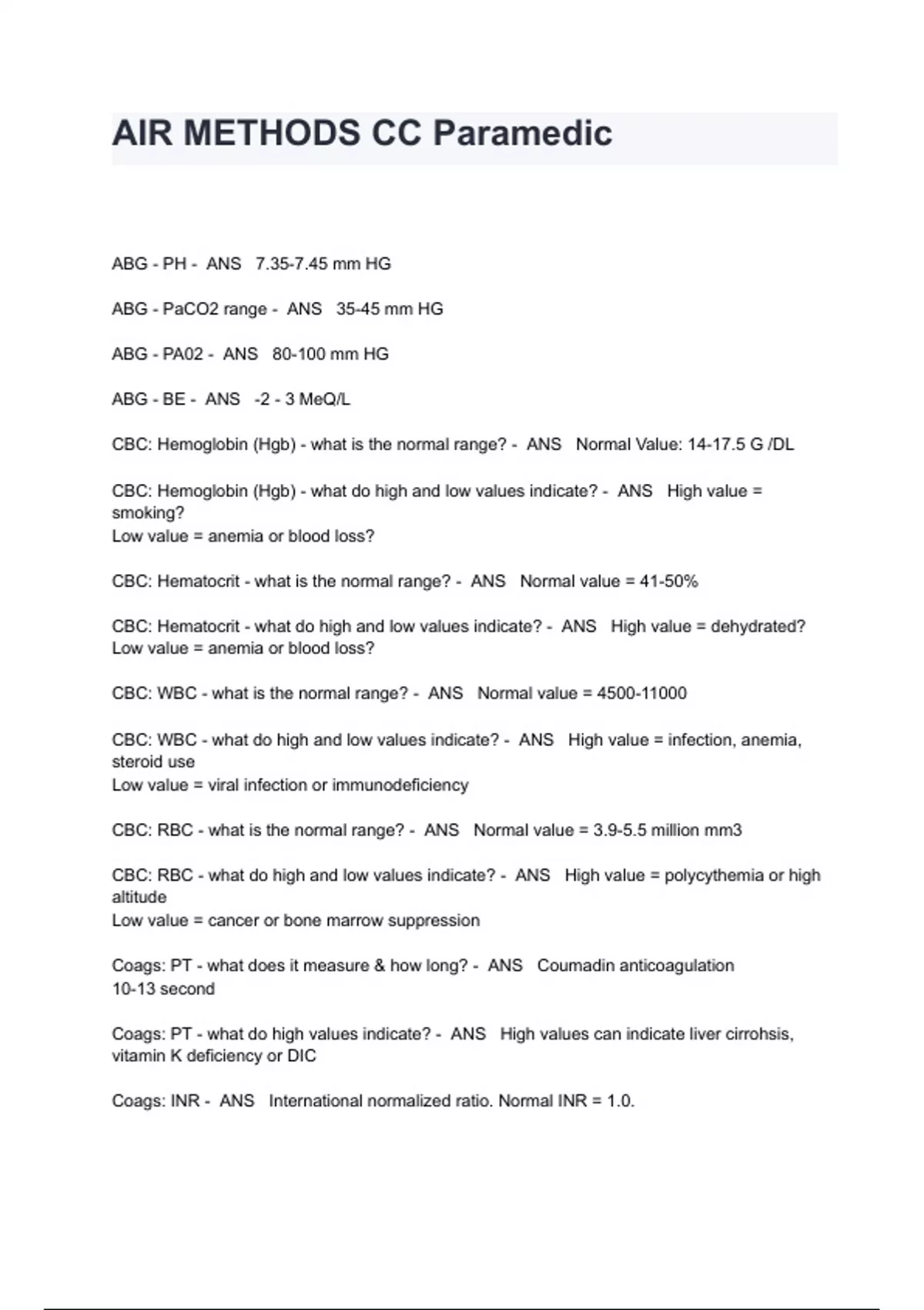 AIR METHODS CC Paramedic Exam Questions And Answers ABG - PH - ANS 7.35-7.45 mm HG ABG - PaCO2 range - ANS 35-45 mm HG ABG - PA02 - ANS 80-100 mm HG ABG - BE - ANS -2 - 3 MeQ/L CBC: Hemoglobin (Hgb) - what is the normal range? - ANS Normal Value: 14-17.5 G /DL CBC: Hemoglobin (Hgb) - what do high and low values indicate? - ANS High value = smoking? Low value = anemia or blood loss? CBC: Hematocrit - what is the normal range? - ANS Normal value = 41-50% CBC: Hematocrit - what do high and low values indicate? - ANS High value = dehydrated? Low value = anemia or blood loss? CBC: WBC - what is the normal range? - ANS Normal value = CBC: WBC - what do high and low values indicate? - ANS High value = infection, anemia, steroid use Low value = viral infection or immunodeficiency CBC: RBC - what is the normal range? - ANS Normal value = 3.9-5.5 million mm3 CBC: RBC - what do high and low values indicate? - ANS High value = polycythemia or high altitude Low value = cancer or bone marrow suppression Coags: PT - what does it measure & how long? - ANS Coumadin anticoagulation 10-13 second Coags: PT - what do high values indicate? - ANS High values can indicate liver cirrohsis, vitamin K deficiency or DIC Coags: INR - ANS International normalized ratio. Normal INR = 1.0.