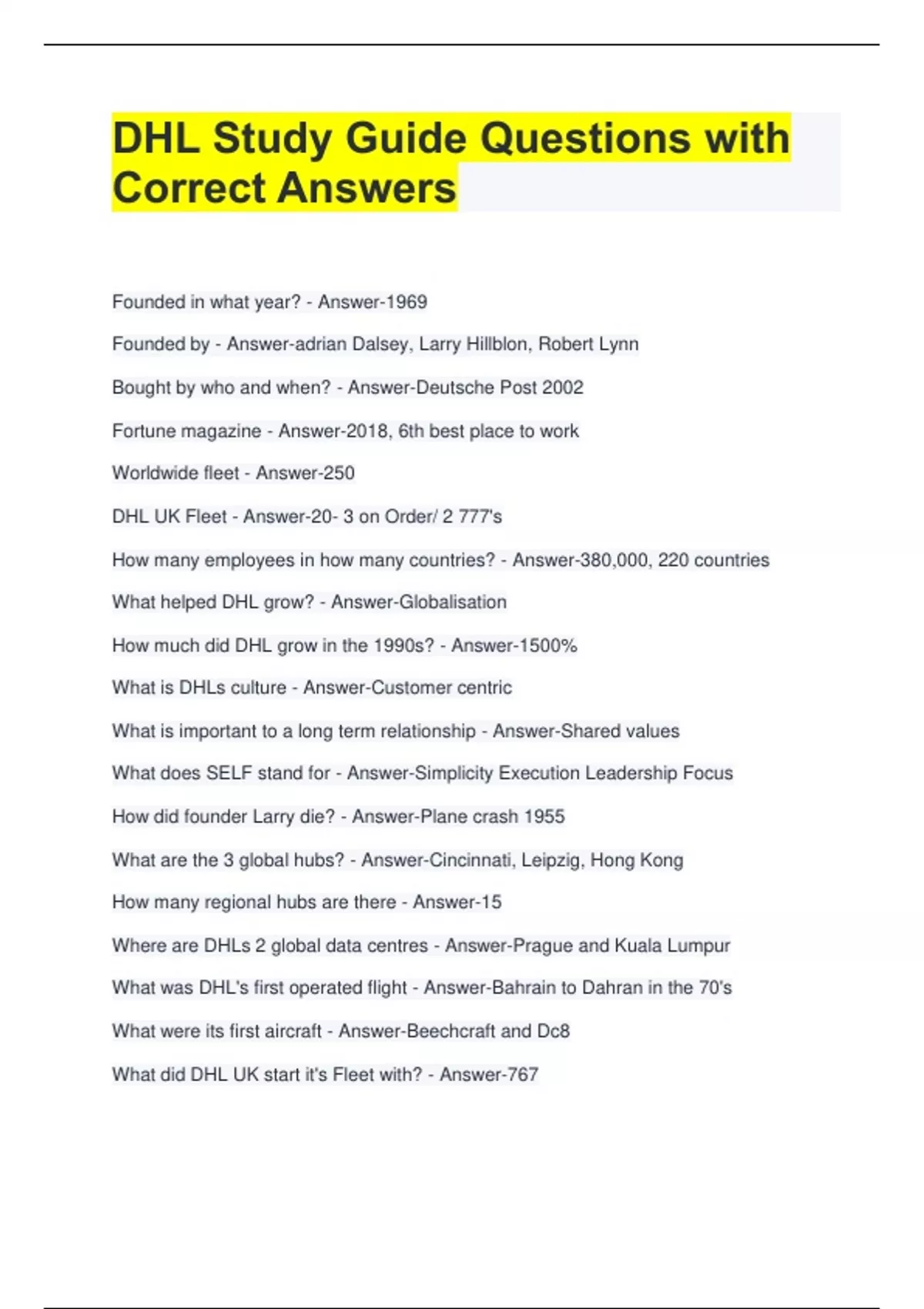 DHL Study Guide Questions with Correct Answers Founded in what year? - Answer-1969 Founded by - Answer-adrian Dalsey, Larry Hillblon, Robert Lynn Bought by who and when? - Answer-Deutsche Post 2002 Fortune magazine - Answer-2018, 6th best place to work Worldwide fleet - Answer-250 DHL UK Fleet - Answer-20- 3 on Order/ 2 777's How many employees in how many countries? - Answer-380,000, 220 countries What helped DHL grow? - Answer-Globalisation