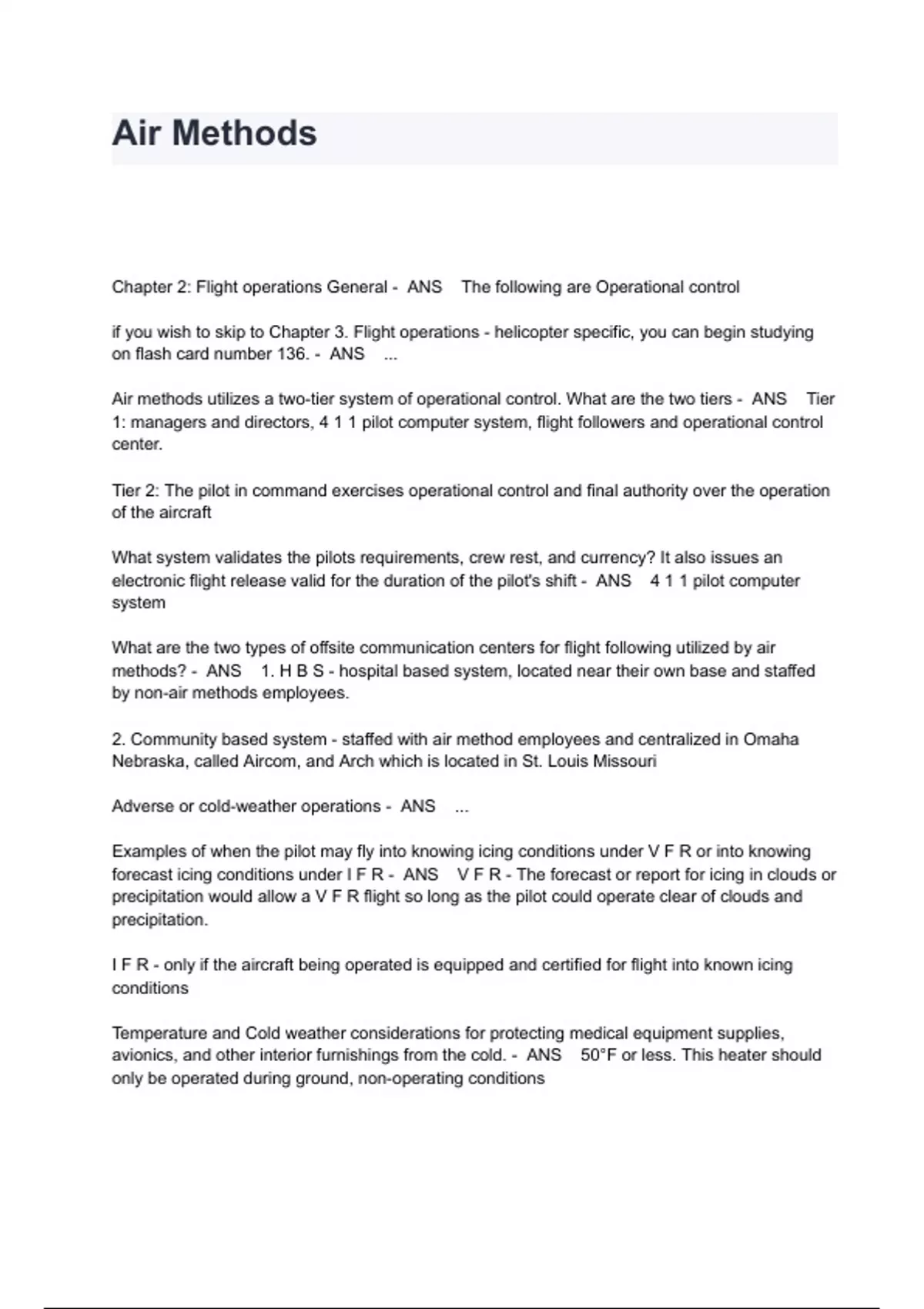Air Methods Exam Questions And Answers All Verified Chapter 2: Flight operations General - ANS The following are Operational control if you wish to skip to Chapter 3. Flight operations - helicopter specific, you can begin studying on flash card number 136. - ANS ... Air methods utilizes a two-tier system of operational control. What are the two tiers - ANS Tier 1: managers and directors, 4 1 1 pilot computer system, flight followers and operational control center. Tier 2: The pilot in command exercises operational control and final authority over the operation of the aircraft What system validates the pilots requirements, crew rest, and currency? It also issues an electronic flight release valid for the duration of the pilot's shift - ANS 4 1 1 pilot computer system What are the two types of offsite communication centers for flight following utilized by air methods? - ANS 1. H B S - hospital based system, located near their own base and staffed by non-air methods employees. 2. Community based system - staffed with air method employees and centralized in Omaha Nebraska, called Aircom, and Arch which is located in St. Louis Missouri Adverse or cold-weather operations - ANS ... Examples of when the pilot may fly into knowing icing conditions under V F R or into knowing forecast icing conditions under I F R - ANS V F R - The forecast or report for icing in clouds or precipitation would allow a V F R flight so long as the pilot could operate clear of clouds and precipitation. I F R - only if the aircraft being operated is equipped and certified for flight into known icing conditions Temperature and Cold weather considerations for protecting medical equipment supplies, avionics, and other interior furnishings from the cold. - ANS 50°F or less. This heater should only be operated during ground, non-operating conditions