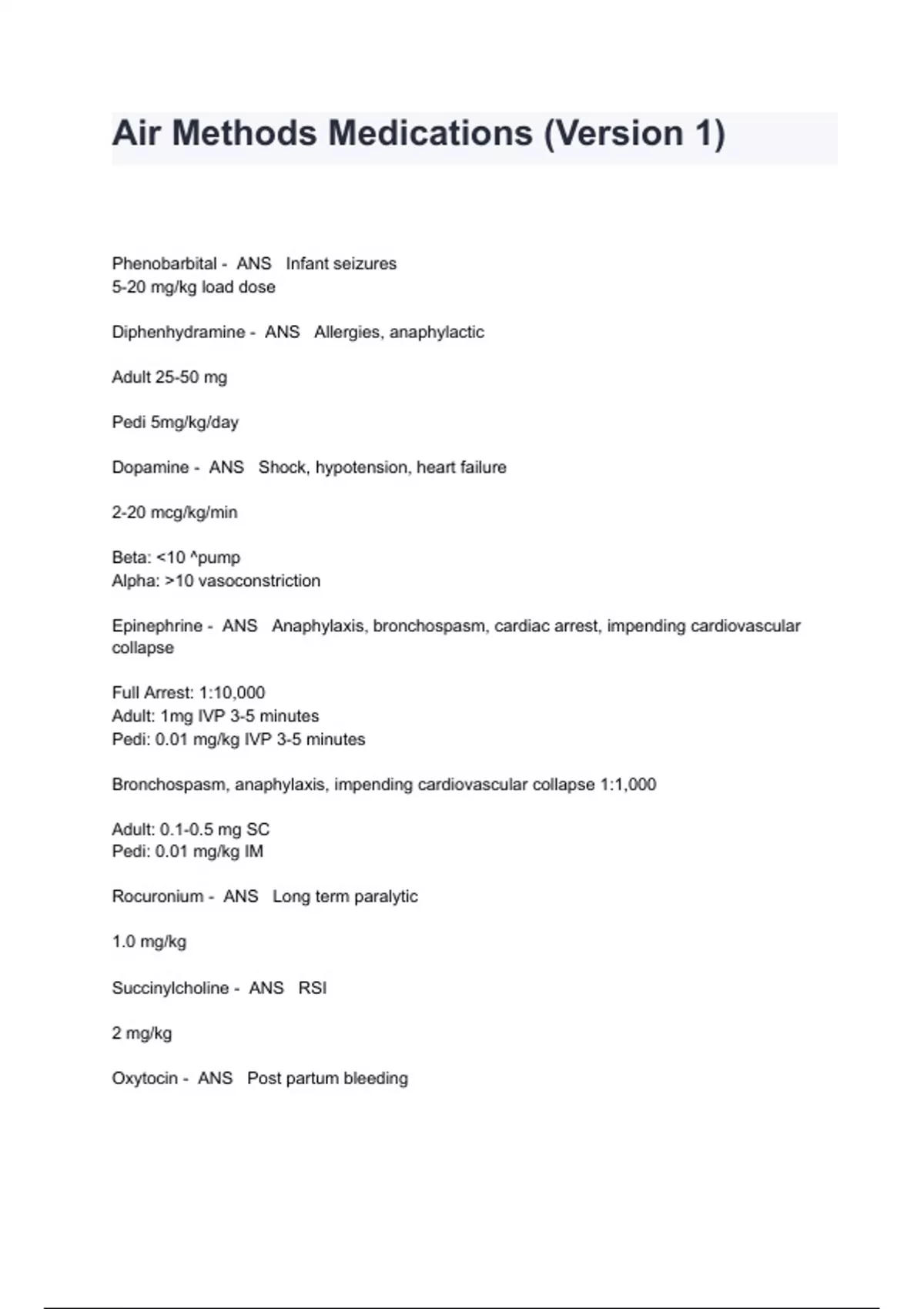Air Methods Medications (Version 1) Exam Questions And Answers Phenobarbital - ANS Infant seizures 5-20 mg/kg load dose Diphenhydramine - ANS Allergies, anaphylactic Adult 25-50 mg Pedi 5mg/kg/day Dopamine - ANS Shock, hypotension, heart failure 2-20 mcg/kg/min Beta: <10 ^pump Alpha: >10 vasoconstriction Epinephrine - ANS Anaphylaxis, bronchospasm, cardiac arrest, impending cardiovascular collapse Full Arrest: 1:10,000 Adult: 1mg IVP 3-5 minutes Pedi: 0.01 mg/kg IVP 3-5 minutes Bronchospasm, anaphylaxis, impending cardiovascular collapse 1:1,000 Adult: 0.1-0.5 mg SC Pedi: 0.01 mg/kg IM Rocuronium - ANS Long term paralytic 1.0 mg/kg Succinylcholine - ANS RSI 2 mg/kg Oxytocin - ANS Post partum bleeding 20-40 milliunits/min infusion Dobutamine - ANS Cardiac decomposition, hypotension 2-20 mcg/kg/min Labetolol - ANS Severe HTN 10-20 mg slow IVP 40 mg 10 min later 80 mg 10 min later Repeating to max 300mg total Ketamine - ANS RSI, pain control RSI: 1-2 mg/kg IVP Analgesic: 0.1-0.25 mg Potassium chloride - ANS Hypokalemia 10-15 meq/hr