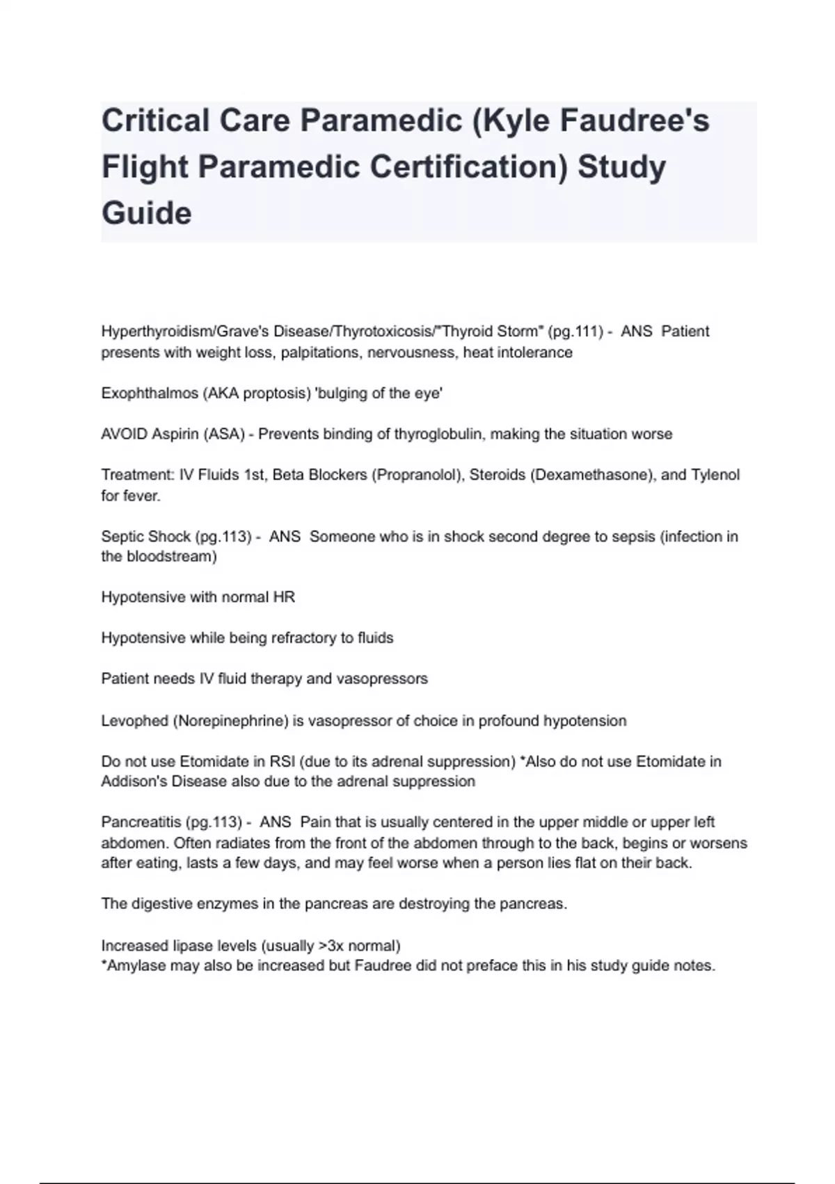 Critical Care Paramedic (Kyle Faudree's Flight Paramedic Certification) Study Guide Hyperthyroidism/Grave's Disease/Thyrotoxicosis/"Thyroid Storm" (pg.111) - ANS Patient presents with weight loss, palpitations, nervousness, heat intolerance Exophthalmos (AKA proptosis) 'bulging of the eye' AVOID Aspirin (ASA) - Prevents binding of thyroglobulin, making the situation worse Treatment: IV Fluids 1st, Beta Blockers (Propranolol), Steroids (Dexamethasone), and Tylenol for fever. Septic Shock (pg.113) - ANS Someone who is in shock second degree to sepsis (infection in the bloodstream) Hypotensive with normal HR Hypotensive while being refractory to fluids Patient needs IV fluid therapy and vasopressors Levophed (Norepinephrine) is vasopressor of choice in profound hypotension Do not use Etomidate in RSI (due to its adrenal suppression) *Also do not use Etomidate in Addison's Disease also due to the adrenal suppression Pancreatitis (pg.113) - ANS Pain that is usually centered in the upper middle or upper left abdomen. Often radiates from the front of the abdomen through to the back, begins or worsens after eating, lasts a few days, and may feel worse when a person lies flat on their back. The digestive enzymes in the pancreas are destroying the pancreas. Increased lipase levels (usually >3x normal) *Amylase may also be increased but Faudree did not preface this in his study guide notes. Demerol for pain (b/c Morphine has the ability to cause spasms of the Sphincter of Oddi) Typically requires surgical intervention. Grey Turner's Sign (pg.113) - ANS Flank ecchymosis caused by hemorrhagic pancreatitis. Cullen's Sign (pg. 113) - ANS Periumbilical ecchymosis caused by hemorrhagic pancreatitis. Hypothyroidism/Myxedema Coma (pg. 112) - ANS Patient presents with fatigue, cold intolerance, weight gain, puffy eyelids, sparse hair, possibly goiter. Primarily occurs in women. >90% cases in winter (b/c the patient has cold intolerance and is not suffering from hypothermia) Officially Myxedema Coma upon changes in LOC. Treatment: Levothyroxine (Synthroid) (T4) or Triostat (T3) IV Cushing's Syndrome (pg.112) - ANS Buffalo hump, moon face, thin arms and legs, purple striae on abdomen. Causes: Excessive use of corticosteroids (Iatrogenic, from corticosteroid treatment(s)) or Tumor Treatment: Usually resolves when corticosteroids are stopped or tumor is removed. Adrenal Insufficiency/Adrenal Crisis (pg. 112) - ANS Also known as (AKA): Addison's Disease Patient presents with depression, malaise, salt craving, and bronze colored skin like JFK. Treatment: Oral steroids (Prednisone) Negative Adrenocorticotropic hormone (ACTH) testing, also known as corticotropin or cosyntropin test. No Etomidate in RSI due to adrenal suppression. Laboratory Values Basic Metabolic Panel (BMP or CHEM7) (pg.106) - ANS Sodium (Na+) Primary Extracellular Cation: 135-145 mEq/L [Helps nerves and muscles interact] Potassium (K+) Primary Intracellular Cation: 3.5-5.0 mEq/L MOST DANGEROUS ABNORMALITY [Responsible for cell excitability, resting me