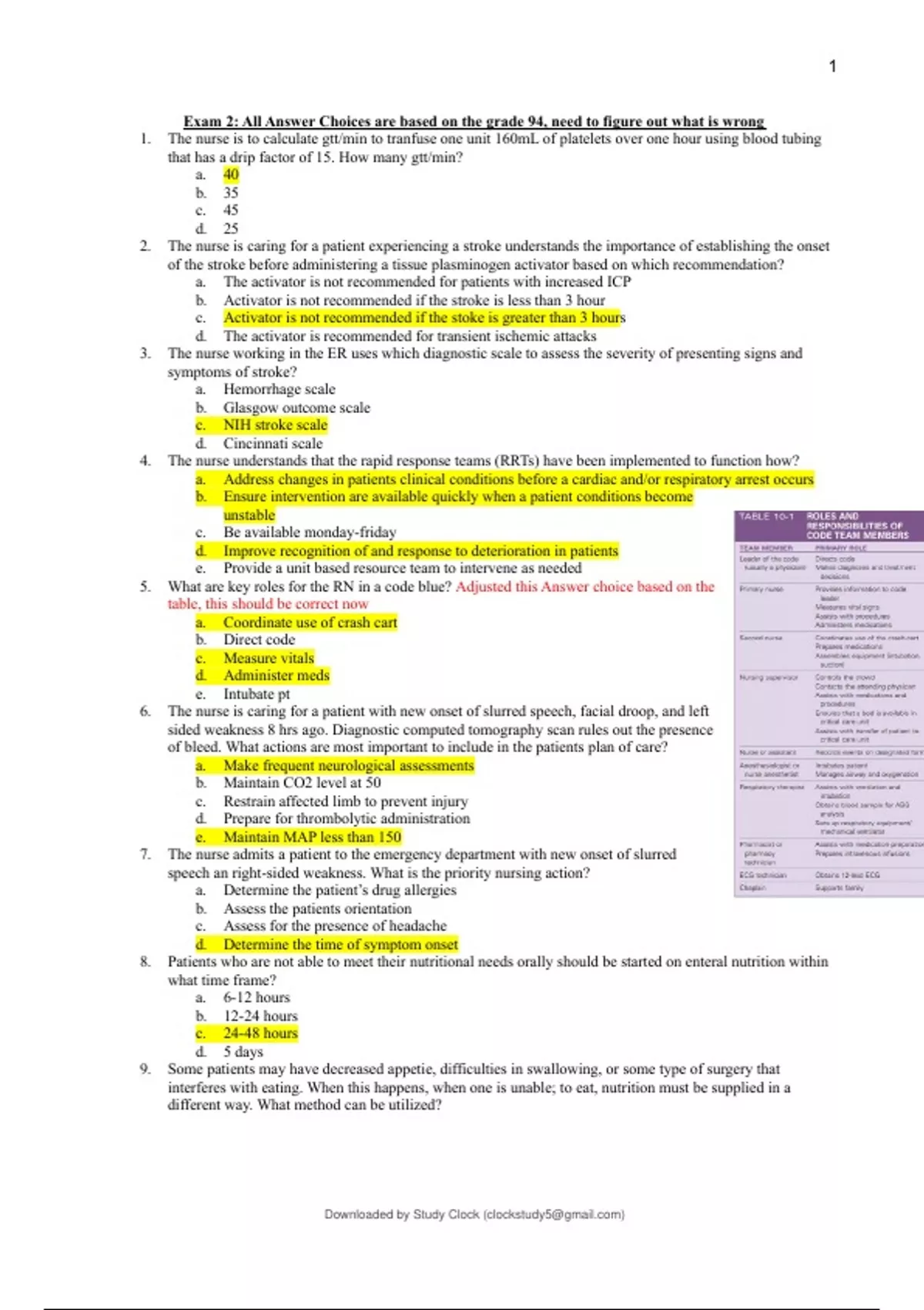 CC Questions - Exam Questions And Answers All Verified And Correct 1. The nurse is to calculate gtt/min to tranfuse one unit 160mL of platelets over one hour using blood tubing that has a drip factor of 15. How many gtt/min? a. 40 b. 35 c. 45 d. 25 2. The nurse is caring for a patient experiencing a stroke understands the importance of establishing the onset of the stroke before administering a tissue plasminogen activator based on which recommendation? a. The activator is not recommended for patients with increased ICP b. Activator is not recommended if the stroke is less than 3 hour c. Activator is not recommended if the stoke is greater than 3 hours d. The activator is recommended for transient ischemic attacks 3. The nurse working in the ER uses which diagnostic scale to assess the severity of presenting signs and symptoms of stroke? a. Hemorrhage scale b. Glasgow outcome scale c. NIH stroke scale d. Cincinnati scale 4. The nurse understands that the rapid response teams (RRTs) have been implemented to function how? a. Address changes in patients clinical conditions before a cardiac and/or respiratory arrest occurs b. Ensure intervention are available quickly when a patient conditions become unstable c. Be available monday-friday d. Improve recognition of and response to deterioration in patients e. Provide a unit based resource team to intervene as needed 5. What are key roles for the RN in a code blue? Adjusted this Answer choice based on the table, this should be correct now a. Coordinate use of crash cart b. Direct code c. Measure vitals d. Administer meds e. Intubate pt 6. The nurse is caring for a patient with new onset of slurred speech, facial droop, and left sided weakness 8 hrs ago. Diagnostic computed tomography scan rules out the presence of bleed. What actions are most important to include in the patients plan of care? a. Make frequent neurological assessments b. Maintain CO2 level at 50 c. Restrain affected limb to prevent injury d. Prepare for thrombolytic administration e. Maintain MAP less than 150 7. The nurse admits a patient to the emergency department with new onset of slurred speech an right-sided weakness. What is the priority nursing action? a. Determine the patient’s drug allergies b. Assess the patients orientation c. Assess for the presence of headache d. Determine the time of symptom onset 8. Patients who are not able to meet their nutritional needs orally should be started on enteral nutrition within what time frame? a. 6-12 hours b. 12-24 hours c. 24-48 hours d. 5 days 9. Some patients may have decreased appetie, difficulties in swallowing, or some type of surgery that interferes with eating. When this happens, when one is unable; to eat, nutrition must be supplied in a