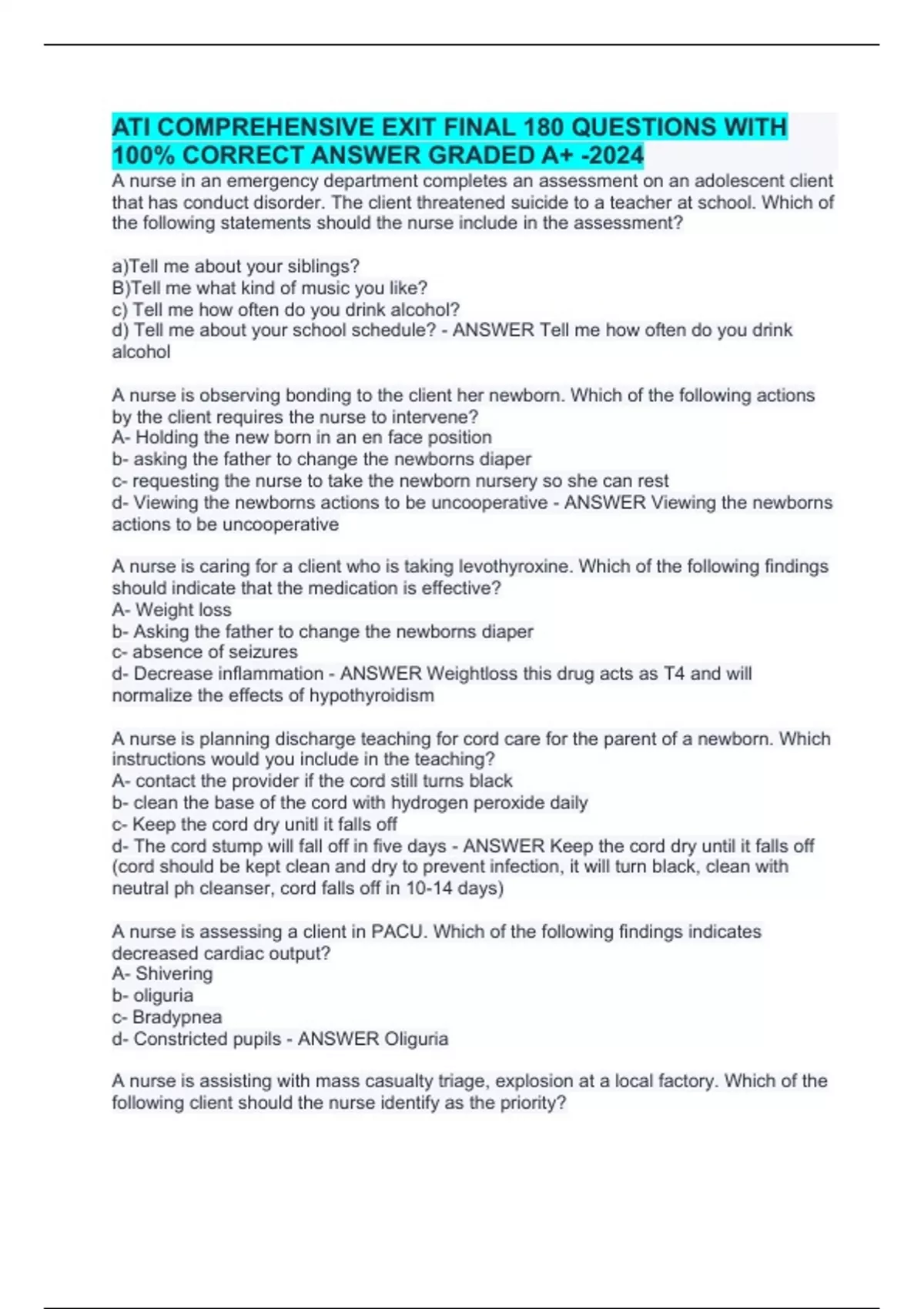 A nurse in an emergency department completes an assessment on an adolescent client that has conduct disorder. The client threatened suicide to a teacher at school. Which of the following statements should the nurse include in the assessment? a)Tell me about your siblings? B)Tell me what kind of music you like? c) Tell me how often do you drink alcohol? d) Tell me about your school schedule? - ANSWER Tell me how often do you drink alcohol A nurse is observing bonding to the client her newborn. Which of the following actions by the client requires the nurse to intervene? A- Holding the new born in an en face position b- asking the father to change the newborns diaper c- requesting the nurse to take the newborn nursery so she can rest d- Viewing the newborns actions to be uncooperative - ANSWER Viewing the newborns actions to be uncooperative A nurse is caring for a client who is taking levothyroxine. Which of the following findings should indicate that the medication is effective? A- Weight loss b- Asking the father to change the newborns diaper c- absence of seizures d- Decrease inflammation - ANSWER Weightloss this drug acts as T4 and will normalize the effects of hypothyroidism A nurse is planning discharge teaching for cord care for the parent of a newborn. Which instructions would you include in the teaching? A- contact the provider if the cord still turns black b- clean the base of the cord with hydrogen peroxide daily c- Keep the cord dry unitl it falls off d- The cord stump will fall off in five days - ANSWER Keep the cord dry until it falls off (cord should be kept clean and dry to prevent infection, it will turn black, clean with neutral ph cleanser, cord falls off in 10-14 days) A nurse is assessing a client in PACU. Which of the following findings indicates decreased cardiac output? A- Shivering b- oliguria c- Bradypnea d- Constricted pupils - ANSWER Oliguria A nurse is assisting with mass casualty triage, explosion at a local factory. Which of the following client should the nurse identify as the priority? A- A client that has massive head trauma B- A client has full thickness burns to face and trunk C- A client with indications of hypovolemic shock D- A client with open fracture of the lower extremity - ANSWER A client with indications of hypovolemic shock A nurse is receiving report on four clients. Which of the following clients should the nurse asses first? A- a client who has illegal conduit and mucus in the pouch b- Client pleasant arteriovenous additional vibration palpated c- Client whose chronic kidney disease with cloudy diasylate outflow D- A client was transurethral resection of the prostate with red tinged urine in the bag - ANSWER A client whose chronic kidney disease with cloudy diasylate outflow A nurse is caring for a client just received the first dose of lisinopril. The following is an appropriate nursing intervention? a- place's cardiac monitoring b- monitor the clients oxygen saturation level c- provide standby assist with the client from bed d- encourage foods high in potassium - ANSWER Provide standby assist with the client from bed A nurse is caring for a client who is in labor and his seat is recieving electronic fetal monitoring. The nurse is reviewing the monitor tracing and notes early decelerations. Which of the following should the nurse expect? a-Feta hypoxia b- abrupto placentae c- post maturity d- head compressions - ANSWER head compressions A nurse is caring for a client who has chronic kidney disease. The nurse should identify which of the following laboratory values as an indication for hemodialysis? a- Glomerular filtration rate of 14 ml/minute b- BUN 16 ml/dl c- serum magnesium 1.8 mg mg/dl d- serum phosphorus 4.0 m mg/dl - ANSWER glomerular filtraion rate of 14 ml/minute A nurse is caring for an infant who has a prescription for continuous pulse oximetry. The following is an appropriate action for the nurse to take? a- placed infant under radiant warmer b- move the probe site every 3 hrs c- heat the skin one minute prior to placing the program d- placed a sensor on the index finger - ANSWER Heat the skin one minute prior to placing the program. A nurse in a mental health facility receives a change to shift report on for clients. Which of the following clients should the nurse plan to asses first? a- A client placed in restraints to the aggressive behavior b- a new limited client pleasures history 4.5 kg weight loss in the past two months c- client is receiving prn dose of health heard all two hours ago for increased anxiety d- Applied he'll be receiving his first ect treatment today - ANSWER Cliet placed in restraints to the aggressive behavior A nurse is working at the clinic is teaching a group of clients who are pregnant on the use of nonpharmacological pain management. Which of the following statements by the nurse is an appropriate description of the use of hypnosis during labor? a- Hypnosis focuses on biofeedback as a relaxation technique b- hypnosis promoted increased control of her pain perception during contractions c- hypnosis uses therpeutic touch to reduce anxiety during labor d- hynosis provides instructions to minimize pain - ANSWER Hypnosis promotes increased control of her pain perception during contractions. A nurse is a county jail health clinic is leading group therapy sessions. A client who has incarcerated for theft is addressing the group. Which of the following is an example of reaction formation? (reaction formation is when using opposite feelings, being super nic