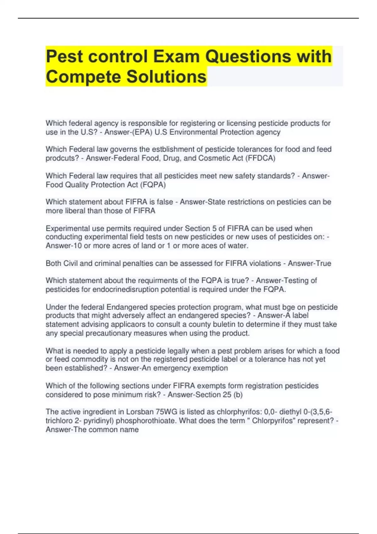 Pest control Exam Questions with Compete Solutions Which federal agency is responsible for registering or licensing pesticide products for use in the U.S? - Answer-(EPA) U.S Environmental Protection agency Which Federal law governs the estblishment of pesticide tolerances for food and feed prodcuts? - Answer-Federal Food, Drug, and Cosmetic Act (FFDCA) Which Federal law requires that all pesticides meet new safety standards? - AnswerFood Quality Protection Act (FQPA) Which statement about FIFRA is false - Answer-State restrictions on pesticies can be more liberal than those of FIFRA Experimental use permits required under Section 5 of FIFRA can be used when conducting experimental field tests on new pesticides or new uses of pesticides on: - Answer-10 or more acres of land or 1 or more aces of water. Both Civil and criminal penalties can be assessed for FIFRA violations - Answer-True Which statement about the requirments of the FQPA is true? - Answer-Testing of pesticides for endocrinedisruption potential is required under the FQPA. Under the federal Endangered species protection program, what must bge on pesticide products that might adversely affect an endangered species? - Answer-A label statement advising applicaors to consult a county buletin to determine if they must take any special precautionary measures when using the product. What is needed to apply a pesticide legally when a pest problem arises for which a food or feed commodity is not on the registered pesticide label or a tolerance has not yet been established? - Answer-An emergency exemption Which of the following sections under FIFRA exempts form registration pesticides considered to pose minimum risk? - Answer-Section 25 (b) The active ingredient in Lorsban 75WG is listed as chlorphyrifos: 0,0- diethyl 0-(3,5,6- trichloro 2- pyridinyl) phosphorothioate. What does the term " Chlorpyrifos" represent? - Answer-The common name Which statement about pesticide label names and ingredients is true? - Answer-Various manufacturers use different trade names, even though the products contain the same active ingredient. What is the purpose of the signal word? - Answer-To give the user an indication of the relative acute toxcity of the prodcut to humans and animals. The route of entry statement on a label "Extremely hazardous by skin contact- rapidly absorbed through the skin" would most likely appear with which signal worrd.? - Answer-DANGER The statement "Do not brethe vapors or spray mist" is an example of - Answer-A specific action statement Which is true about statements of practical treatment? - Answer-All DANGER labels contain a note to physicians describing appropriate medical procedures. Directions for mixing and loading a pesticide are usually found under: - Answer-The directions for use. Who is responsible for developing MSD's on specific checmicals and providing them on request? - Answer-The product manufacturer