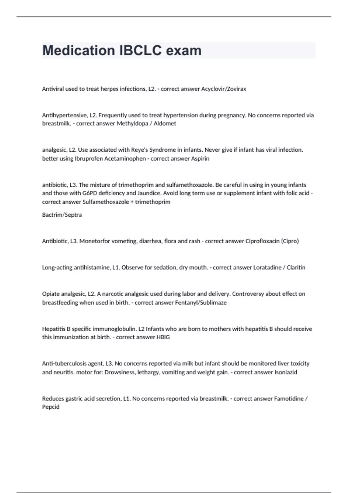 Medication IBCLC exam Antiviral used to treat herpes infections, L2. - correct answer Acyclovir/Zovirax Antihypertensive, L2. Frequently used to treat hypertension during pregnancy. No concerns reported via breastmilk. - correct answer Methyldopa / Aldomet analgesic, L2. Use associated with Reye's Syndrome in infants. Never give if infant has viral infection. better using Ibruprofen Acetaminophen - correct answer Aspirin antibiotic, L3. The mixture of trimethoprim and sulfamethoxazole. Be careful in using in young infants and those with G6PD deficiency and Jaundice. Avoid long term use or supplement infant with folic acid - correct answer Sulfamethoxazole + trimethoprim Bactrim/Septra Antibiotic, L3. Monetorfor vometing, diarrhea, flora and rash - correct answer Ciprofloxacin (Cipro) Long-acting antihistamine, L1. Observe for sedation, dry mouth. - correct answer Loratadine / Claritin Opiate analgesic, L2. A narcotic analgesic used during labor and delivery. Controversy about effect on breastfeeding when used in birth. - correct answer Fentanyl/Sublimaze Hepatitis B specific immunoglobulin. L2 Infants who are born to mothers with hepatitis B should receive this immunization at birth. - correct answer HBIG Anti-tuberculosis agent, L3. No concerns reported via milk but infant should be monitored liver toxicity and neuritis. motor for: Drowsiness, lethargy, vomiting and weight gain. - correct answer Isoniazid Reduces gastric acid secretion, L1. No concerns reported via breastmilk. - correct answer Famotidine / Pepcid