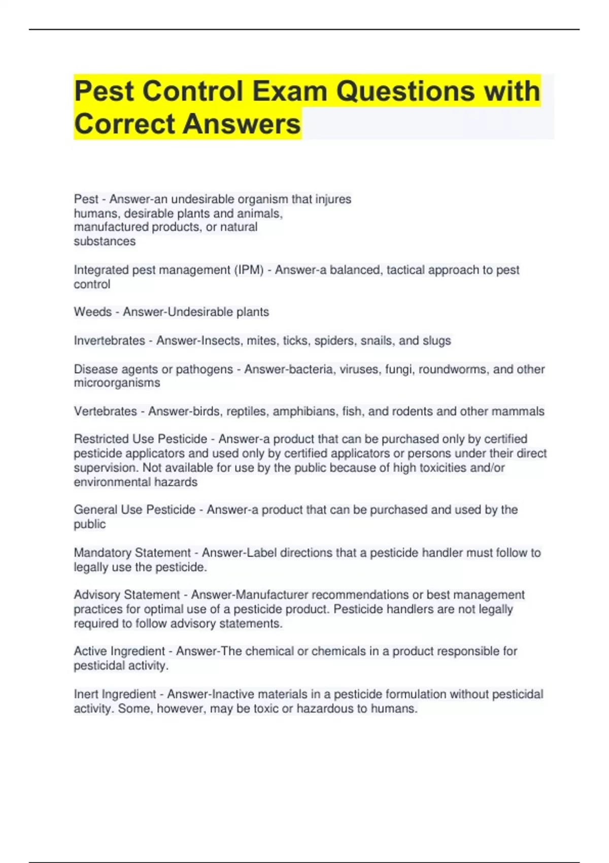 Pest Control Exam Questions with Correct Answers Pest - Answer-an undesirable organism that injures humans, desirable plants and animals, manufactured products, or natural substances Integrated pest management (IPM) - Answer-a balanced, tactical approach to pest control Weeds - Answer-Undesirable plants Invertebrates - Answer-Insects, mites, ticks, spiders, snails, and slugs Disease agents or pathogens - Answer-bacteria, viruses, fungi, roundworms, and other microorganisms Vertebrates - Answer-birds, reptiles, amphibians, fish, and rodents and other mammals Restricted Use Pesticide - Answer-a product that can be purchased only by certified pesticide applicators and used only by certified applicators or persons under their direct supervision. Not available for use by the public because of high toxicities and/or environmental hazards General Use Pesticide - Answer-a product that can be purchased and used by the public Mandatory Statement - Answer-Label directions that a pesticide handler must follow to legally use the pesticide. Advisory Statement - Answer-Manufacturer recommendations or best management practices for optimal use of a pesticide product. Pesticide handlers are not legally required to follow advisory statements. Active Ingredient - Answer-The chemical or chemicals in a product responsible for pesticidal activity. Inert Ingredient - Answer-Inactive materials in a pesticide formulation without pesticidal activity. Some, however, may be toxic or hazardous to humans. Adjuvants - Answer-a substance added to a pesticide to improve its effectiveness or safety. Allergic Effects - Answer-Hypersensitivity to a specific substance, often called the allergen. An allergy may cause dermatitis, blisters, or hives. It could also cause illness, asthma, or life-threatening shock. Acute Exposure - Answer-Exposure to a single dose of pesticide Delayed Effects - Answer-Illnesses or injuries that do not appear immediately (within 24 hours) after exposure to a pesticide. The effects may be delayed for weeks, months, or even years. Fit Test (QUALITATIVE) - Answer-A method to assess whether a particular size and brand of respirator adequately fits an individual's face using a test agent. If the person can detect inside the mask an agent that is outside the mask, there is leakage at the seal and the mask does not fit properly.