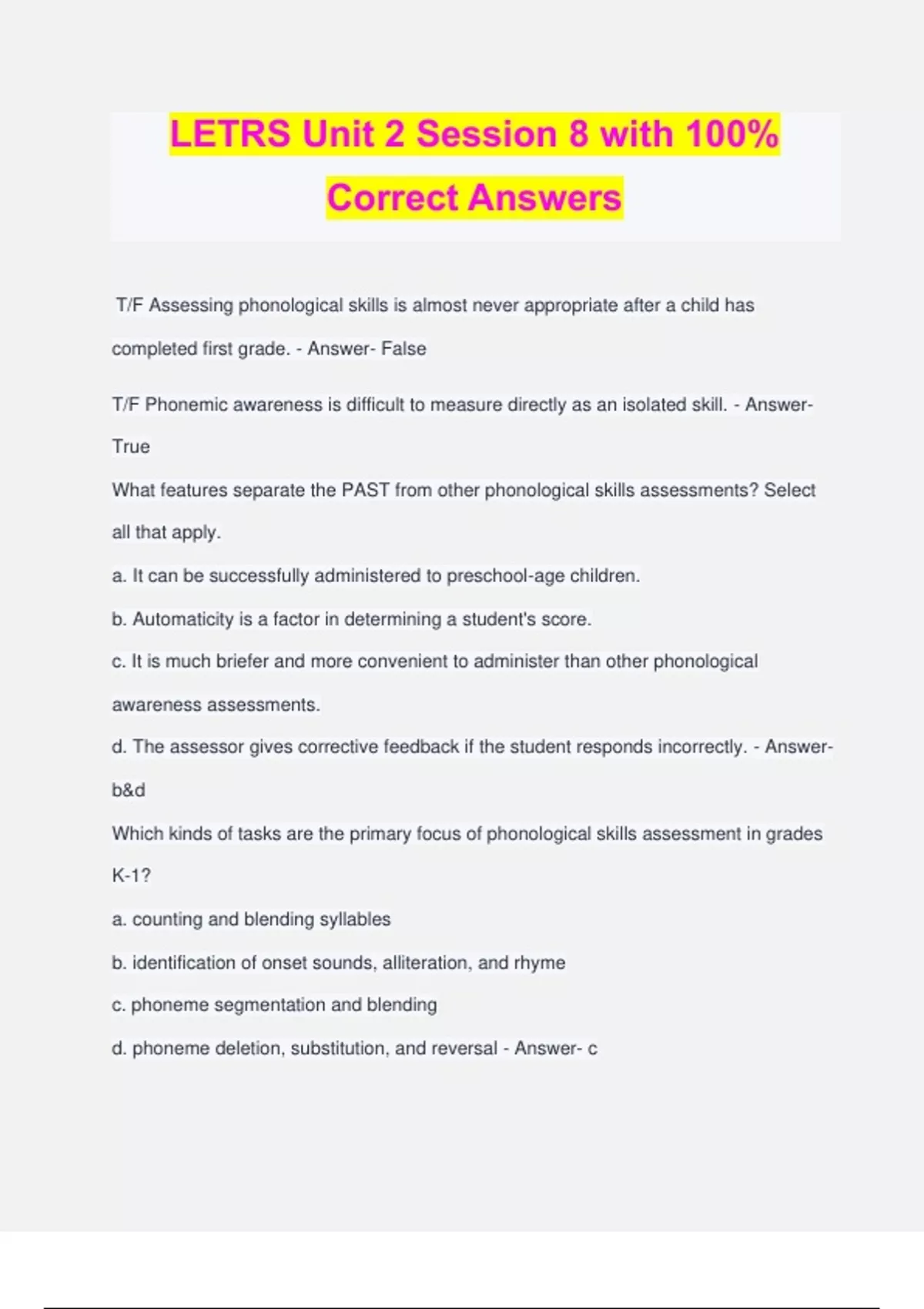 LETRS Unit 2 Session 8 with 100% Correct Answers T/F Assessing phonological skills is almost never appropriate after a child has completed first grade. - Answer- False T/F Phonemic awareness is difficult to measure directly as an isolated skill. - Answer- True What features separate the PAST from other phonological skills assessments? Select all that apply. a. It can be successfully administered to preschool-age children. b. Automaticity is a factor in determining a student's score. c. It is much briefer and more convenient to administer than other phonological awareness assessments. d. The assessor gives corrective feedback if the student responds incorrectly. - Answer- b&d Which k