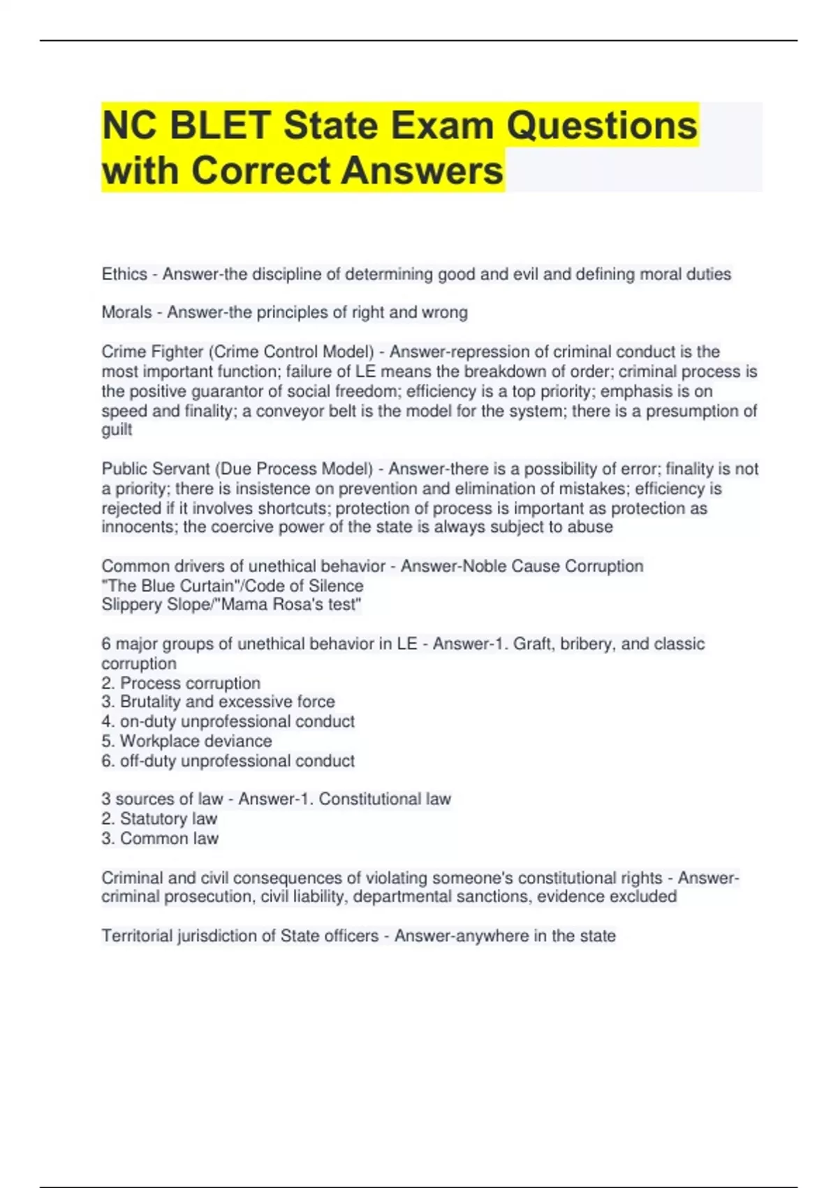 NC BLET State Exam Questions with Correct Answers Ethics - Answer-the discipline of determining good and evil and defining moral duties Morals - Answer-the principles of right and wrong Crime Fighter (Crime Control Model) - Answer-repression of criminal conduct is the most important function; failure of LE means the breakdown of order; criminal process is the positive guarantor of social freedom; efficiency is a top priority; emphasis is on speed and finality; a conveyor belt is the model for the system; there is a presumption of guilt Public Servant (Due Process Model) - Answer-there is a possibility of error; finality is not a priority; there is insistence on prevention and elimination of mistakes; efficiency is rejected if it involves shortcuts; protection of process is important as protection as innocents; the coercive power of the state is always subject to abuse Common drivers of unethical behavior - Answer-Noble Cause Corruption "The Blue Curtain"/Code of Silence Slippery Slope/"Mama Rosa's test" 6 major groups of unethical behavior in LE - Answer-1. Graft, bribery, and classic corruption 2. Process corruption 3. Brutality and excessive force 4. on-duty unprofessional conduct 5. Workplace deviance 6. off-duty unprofessional conduct 3 sources of law - Answer-1. Constitutional law 2. Statutory law 3. Common law Criminal and civil consequences of violating someone's constitutional rights - Answercriminal prosecution, civil liability, departmental sanctions, evidence excluded Territorial jurisdiction of State officers - Answer-anywhere in the state Territorial jurisdiction of County officers - Answer-in the county; any property owned by the county (even if it is outside the county); as well as any waterways adjacent/surrounding the county Territorial jurisdiction of municipal/city police - Answer-city limits + 1 mile (even if it crosses city or state lines); any property owned by the city outside the city limits Territorial jurisdiction of campus police - Answer-on campus; any roadway adjacent to campus; IF the city and campus make an agreement, then campus PO can have jurisdiction outside of campus Territorial jurisdiction of company police - Answer-property owned by the company plus any location that they are contracted to work in What makes LE different than any other public business? - Answer-Public Trust Can you accept gifts and favors? - Answer-NO Who are you in control of for professional purposes? - Answer-Yourself, my own standard of professionalism Do your personal feelings get involved with decisions? - Answer-NO, do the right thing, the right way Which source of law deals with governmental habits and customs? - AnswerConstitutional Law Who can issue a warrant? - Answer-A Judicial Official Where is a warrant valid? - Answer-Anywhere in the state Does a defendant need to be named or sufficiently described? - Answer-Sufficiently described Who is a warrant addressing? - Answer-The officer Who is a criminal summons addressing? - Answer-The defendant - advising them to come to court What are warrantless arrests? - Answer-i.e. shoplifting, concealment of merchandise, price tag substitution, domestic criminal trespass, driving while impaired, DWI commercial vehicle What are the qualifications for a warrantless arrest? - Answer-Felony; misdemeanors observed in the officer's presence; domestic violence assault