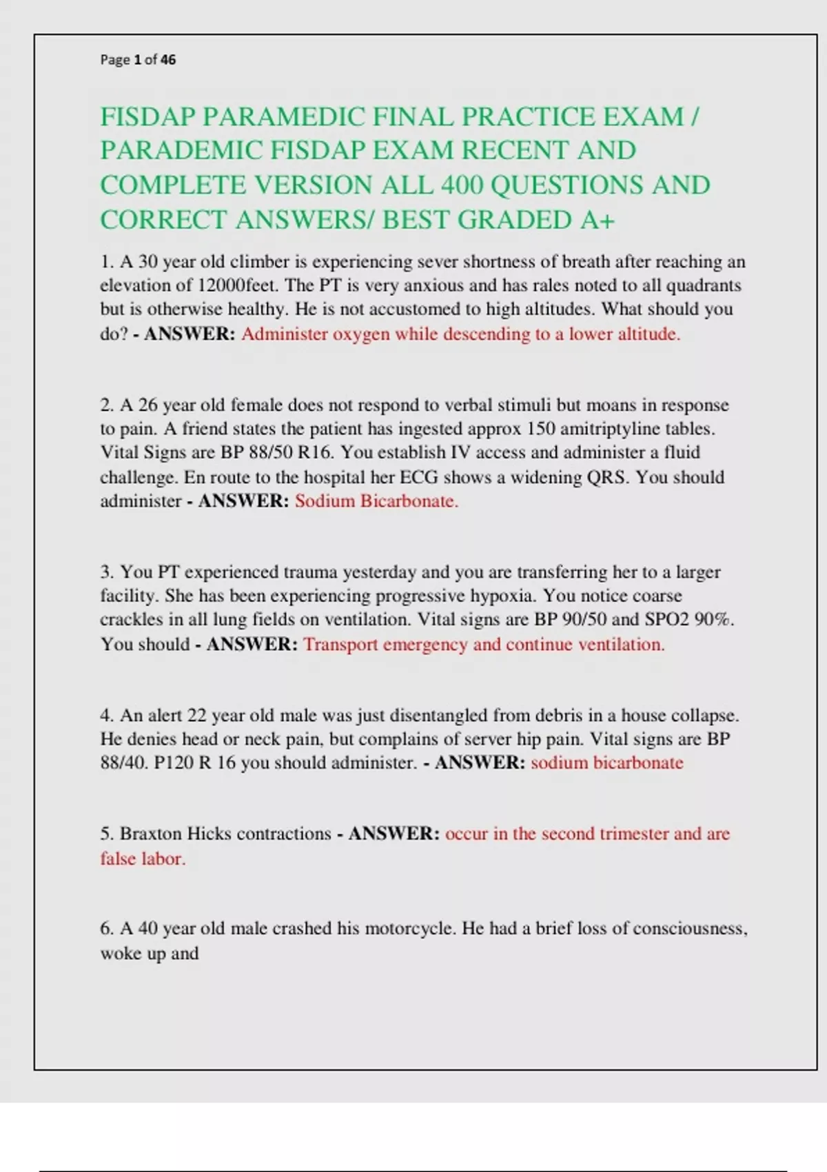 FISDAP PARAMEDIC FINAL PRACTICE EXAM / PARADEMIC FISDAP EXAM RECENT AND COMPLETE VERSION ALL 400 QUESTIONS AND CORRECT ANSWERS/ BEST GRADED A+