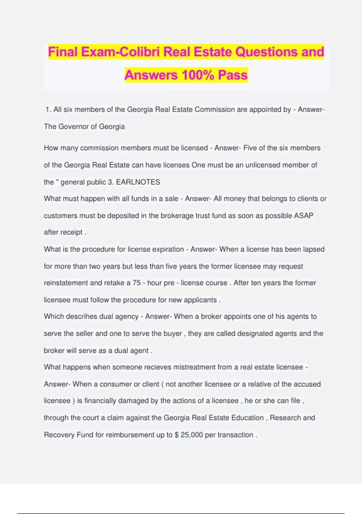 Final Exam-Colibri Real Estate Questions and Answers 100% Pass 1. All six members of the Georgia Real Estate Commission are appointed by - Answer- The Governor of Georgia How many commission members must be licensed - Answer- Five of the six members of the Georgia Real Estate can have licenses One must be an unlicensed member of the " general public 3. EARLNOTES What must happen with all funds in a sale - Answer- All money that belongs to clients or customers must be deposited in the brokerage trust fund as soon as possible ASAP after receipt . What is the procedure for license expiration - Answer- When a license has been lapsed for more than two years but less than five years the former licensee may request reinstatement and retake a 75 - hour pre - license course . After ten years the former licensee must follow the procedure for new applicants . Which descrihes dual agency - Answer- When a broker appoints one of his agents to serve the seller and one to serve the buyer , they are called designated agents and the broker will serve as a dual agent . What happens when someone recieves mistreatment from a real estate licensee - Answer- When a consumer or client ( not another licensee or a relative of the accused licensee ) is financially damaged by the actions of a licensee , he or she can file , through the court a claim against the Georgia Real Estate Education , Research and Recovery Fund for reimbursement up to $ 25,000 per transaction . For a brokerage or any licensee under a managing broker to be considered a Dual Agent , he / she must - Answer- obtain written permission from both the seller and the buyer before acting on behalf of either party . BIRTH MONTHS When are renewal deadlines for licensees - Answer- All renewal deadlines for licenses are set for the last day of the licensee's birth month every four full years . ( The licensee's first renewal period may be longer , depending on when the license was obtained . It starts the last day of the birth month that arrives after the license is obtained ) . What is the training hours required for licensees - Answer- Assuming a licensee has competed the 25 - hour GA Post License Course during the first year of licensure ) , he will receive credit for 9 hours of Continuing education and will only need to complete 27 hours of CE during the rest of the licensee's first licensure period . For the second four - year period and each renewal thereafter . the requirement is 36 hours of CE. If a buyer client wishes to withdraw from a contract and get h his earnest money returned the salesperson must - Answer- REFER the issue to the EMPLOYING or managing BROKER for a decision When every original license fee is received , of the funds received _____from each license fee is allocated to fund the RE Education , Research and Recovery Fund - Answer- 20$ The clause in an agency agreement used to safeguard the broker from unscrupulous buyers or sellers , who would take the broker's generated leads , but then buy or sell the property once the listing agreement has expired in order to avoid paying the commission to the licensee is known as - Answer- The Safety or Carryover Extender Clause . Under GA Law , a listing broker - Answer- does not have to share his sales commission with the selling broker who has procured the ultimate buyer, this is legal and not against GA real estate law. Every brokerage must maintain - Answer- an accounting system to detail all receipts and deposits received from others that are under the control of the brokerage. When two people want to simply exchange one property for for another , the person who handles the details for a fee must have - Answer- either a real estate license or a law license Members of the Georgia Real Estate Commission serve - Answer- 5 year terms Whenever a property owner engages a licensee to list list property for sale where the commission is not a pre set percentage or simple dollar value but will be all funds than remain after the owner receives a certain amount the arrangement is called a - Answer- NET LISTING and is illegal . In order to change from one brokerage to another the licensee needs to - Answer- get the current managing broker to to sign a release form and send it to the commission A Managing broker must have all licensed and unlicensed staff , whether employees or independent contractors - Answer- sign a written employment agreement setting forth the relationship , the duties , and the compensation