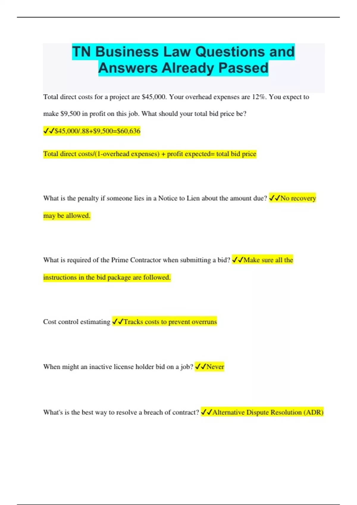 TN Business Law Questions and Answers Already Passed Total direct costs for a project are $45,000. Your overhead expenses are 12%. You expect to make $9,500 in profit on this job. What should your total bid price be? $45,000/.88+$9,500=$60,636 Total direct costs/(1-overhead expenses) + profit expected= total bid price What is the penalty if someone lies in a Notice to Lien about the amount due? No recovery may be allowed. What is required of the Prime Contractor when submitting a bid? Make sure all the instructions in the bid package are followed. Cost control estimating Tracks costs to prevent overruns When might an inactive license holder bid on a job? Never What's is the best way to resolve a breach of contract? Alternative Dispute Resolution (ADR) Under the Fair Labor Standards Act, what is a laborer considered? Skilled labor, unskilled labor, exempt employee, non-exempt employee ABC Contracting wants to submit a bid on a project that is higher than their Monetary Limit. When must they apply for a Monetary Limit increase? Before submitting the bid Employee handbooks items not needed to be included: Copyright Bid envelope must include: Contract License #, Expiration date, trade What is a contract that does not provide a change order function? Lump Sum Contract FMLA allows 12 weeks in support of: Adopting a Child Method to minimize employee exposure to Hazardous Materials: Use low VOC materials in the process. Method not used to calculate the cost of a change order: Accrual When must you have 1096 forms filled? February 28th License renewal requires remitting: Workers Compensation insurance coverage You have to purchase items for your project. They cost $35 each. There is a discount of 2% when you purchase 25 to 50 items, 6% discount when you purchase 51 to 100 items. What is the cost of your purchase when you buy 80? $2,718.80 24x$35=$840 26x$34.30=891.80 30x$32.90=$987.00 Two contractors with $500K limits want to form a joint venture to bid on a $1,000,000. Is this legal? Yes it's allowed because one of the purposes of a joint Venture is to pool resources. What is the maximum punishment the Board can issue to a contractor found to be in gross negligence? Revoke the license. (The Board can also impose fines up to $5,000 in TN so the "real world" maximum penalty is to revoke license and fine $5,000)