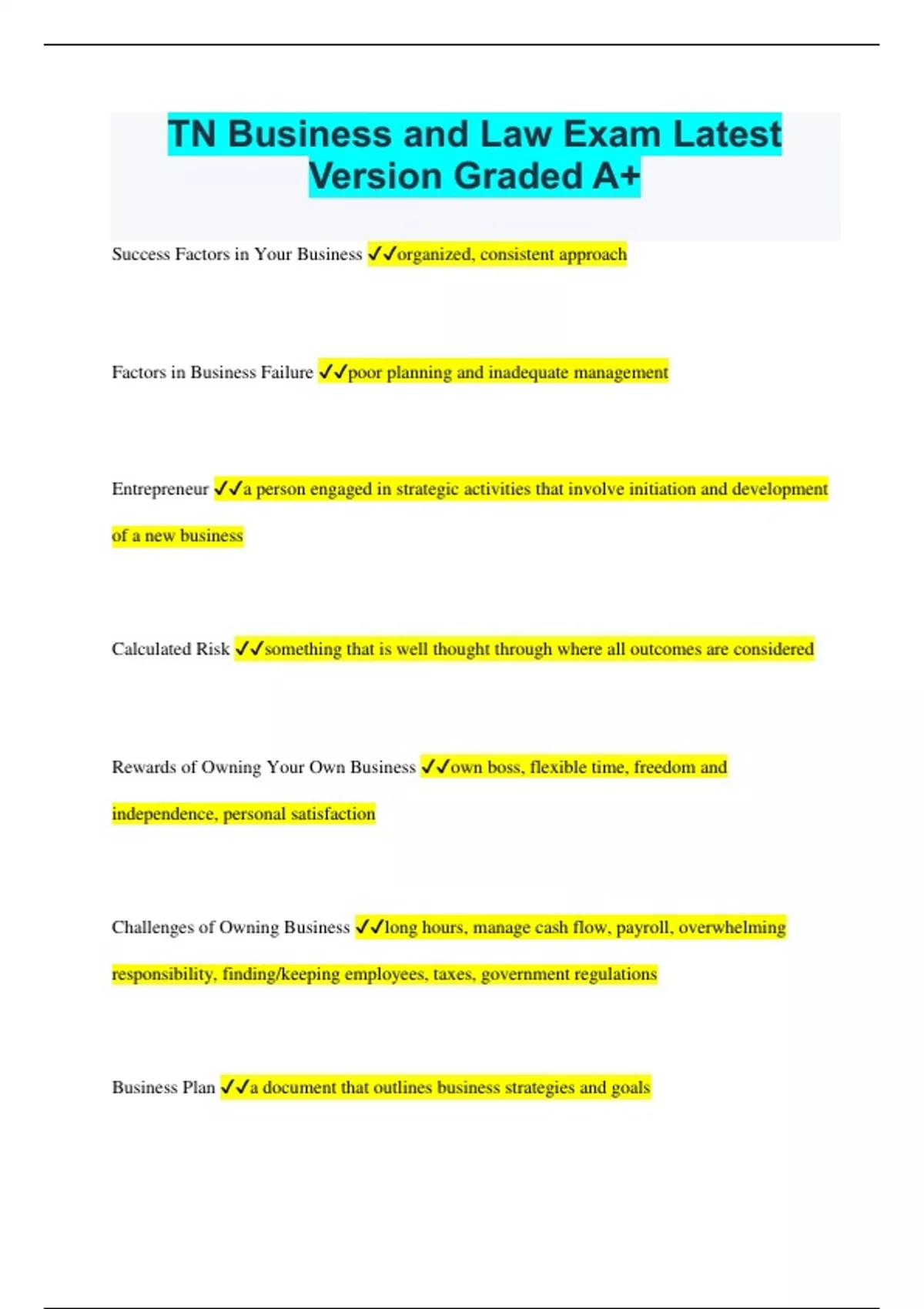 TN Business and Law Exam Latest Version Graded A+ Success Factors in Your Business organized, consistent approach Factors in Business Failure poor planning and inadequate management Entrepreneur a person engaged in strategic activities that involve initiation and development of a new business Calculated Risk something that is well thought through where all outcomes are considered Rewards of Owning Your Own Business own boss, flexible time, freedom and independence, personal satisfaction Challenges of Owning Business long hours, manage cash flow, payroll, overwhelming responsibility, finding/keeping employees, taxes, government regulations Business Plan a document that outlines business strategies and goals Key Functions of a Business Plan planning tool, loan or investor document, benchmarking tool Element of a Business Plan cover page, executive summary, company summary, products and services, market analysis, market strategy, financial plan What could be a pitfall to a business plan? must portray an accurate picture of business What are the different types of business structures? sole proprietorship, partnership, c corporation, s corporation, limited liability company Sole Proprietorship a business that has one individual as the owner who is responsible for 100% of the decisions made on behalf of the business and owns all of the business assets Advantages of a Sole Proprietorship minimal legal restrictions, simple ownership form, low startup cost, sole owner of profits, freedom in decision making Disadvantages to a Sole Proprietorship unlimited liability, less available capital, possible difficulty in obtaining long term financing, dissolution of the business in even of owner death Partnership a business relationship between two or more persons who join to carry on a trade or business. each person contributes money, property, labor, or skill, and each partner expects to share in the profits and losses of the business. Two types of partnership general and limited Advantages of a General Partnership ease of formation, direct profit rewards, larger management base than that of a sole proprietorship Disadvantages to a General Partnership unlimited liability, potential for disagreements, lack of continuity, difficulty in withdrawing from a partnership C Corporation a legal business entity that has independent ownership of assets and liabilities from its shareholders Requirements of C Corporation board of directors and corporate officers, stockholders as owner of the company, board meetings, board empowered to authorize certain actions Advantages of a C Corporation separate legal entity, limited liability for stockholders, unlimited life of the business, availability of capital resources, transfer of ownership though stock Disadvantages to a C Corporation