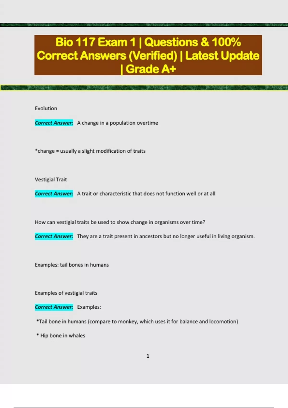 Bio 117 Exam 1 | Questions & 100% Correct Answers (Verified) | Latest Update | Grade A+ Evolution Correct Answer: A change in a population overtime *change = usually a slight modification of traits Vestigial Trait Correct Answer: A trait or characteristic that does not function well or at all How can vestigial traits be used to show change in organisms over time? Correct Answer: They are a trait present in ancestors but no longer useful in living organism. Examples: tail bones in humans Examples of vestigial traits Correct Answer: Examples: *Tail bone in humans (compare to monkey, which uses it for balance and locomotion) * Hip bone in whales 2 * Goosebumps in humans (erect hair on chimp- insulation/emotional display) Describe the three types of homology discussed in class that are used as evidence for decent of extant species from common ancestors. Correct Answer: 1. Comparative Anatomy 2. Comparative Embryology 3. Molecular Biology homology Correct Answer: If organisms are similar than they came from the same origin. Homologous Sructures Correct Answer: When we have similar body parts it means we could have come from similar origins. Embryology Correct Answer: The embryonic stages of life of many organisms are very similar Biogeography Correct Answer: Deals with how plants & animals are distributed. How does the fossil record corroborate phylogenetic history? 3 Correct Answer: Events that occur early in the fossil record are represented by branching events nearer to the root of the phylogenetic tree A taxon that includes a single common ancestor and all its descendants is a __________________. Correct Answer: monophyletic group extant species Correct Answer: still alive; in existence today Comparative Anatomy Correct Answer: similar bone structure Comparative Embryology Correct Answer: Early stages of development are very similar. Molecular Biology Correct Answer: types and number of proteins in The types of homology that are used as evidence for decent of extant species from common ancestors Correct Answer: 1. Biogeography 4 2. Genetic 3. Structural 4. Developmental How can fossils provide evidence for macro-evolution processes such as the divergence of two species from a common ancestor? Correct Answer: by exhibiting some features of ancestral organisms and some of derived organism Biogeography (homology) Correct Answer: similar species found in the same geographic area In phylogenetic tree, a node represent