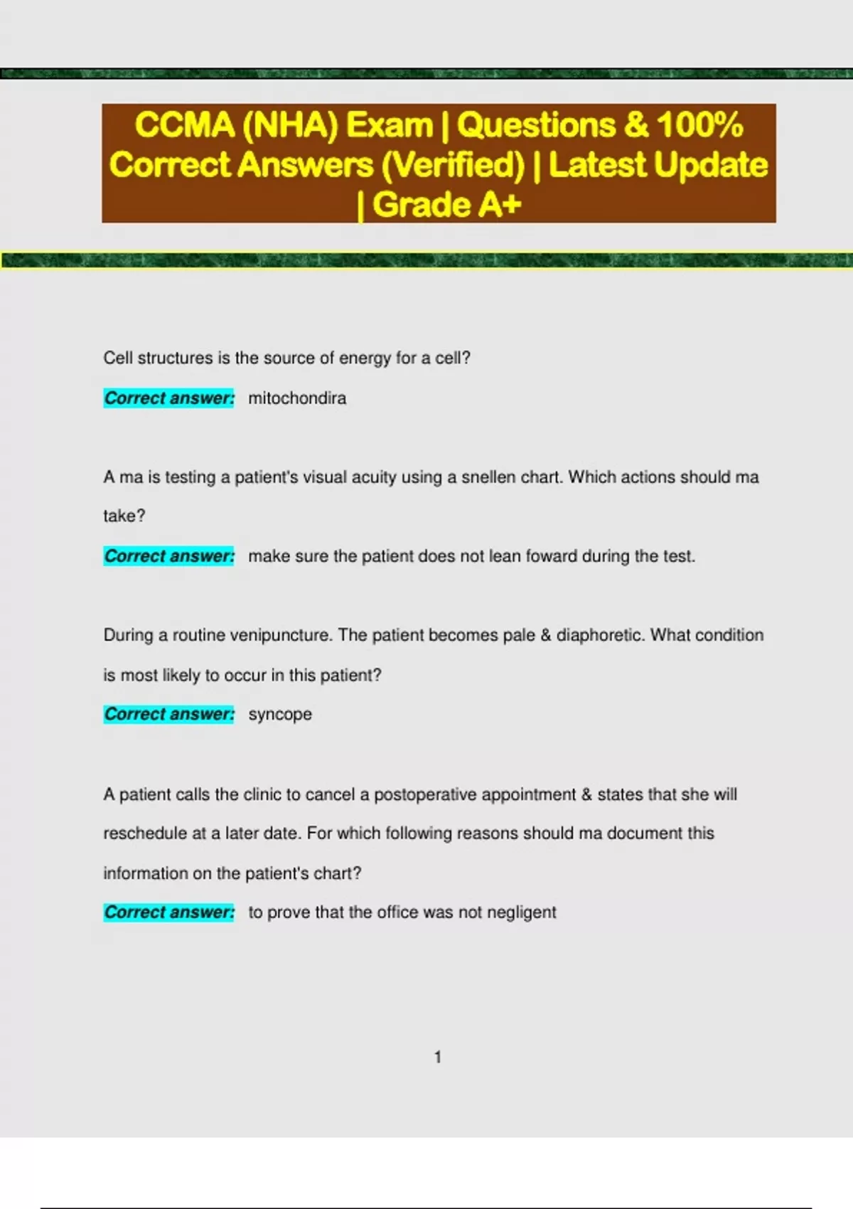 CCMA (NHA) Exam | Questions & 100% Correct Answers (Verified) | Latest Update | Grade A+ Cell structures is the source of energy for a cell? Correct answer: mitochondira A ma is testing a patient's visual acuity using a snellen chart. Which actions should ma take? Correct answer: make sure the patient does not lean foward during the test. During a routine venipuncture. The patient becomes pale & diaphoretic. What condition is most likely to occur in this patient? Correct answer: syncope A patient calls the clinic to cancel a postoperative appointment & states that she will reschedule at a later date. For which following reasons should ma document this information on the patient's chart? Correct answer: to prove that the office was not negligent 2 When completing documentation in a patient's paper medical record, a ma realizes she made an error. Which actions should ma take? Correct answer: draw a line through the error & initial it Which items included on the cms-1500 claim form should a ma recognize as indicating the medical necessity of a procedure? Correct answer: diagnosis code Which techniques should a ma use to confirm a patient's understanding of insulin administration? Correct answer: observe the patient as she performs a self-demonstration A ma is preparing a community resource library. Which actions should ma take 1st? Correct answer: compile a list of local community agencies A ma is disposing of the syringe and needle she used to inject a seasonal influenza vaccine which of the following actions should the assistant take? Correct answer: drop the syringe, needle first, into the biohazards sharp container A ma is preparing a patient who has psoriasis to be examined by the provider. When inspecting the patient's skin lesions, the ma should expect to observe which of the following characteristics? Correct answer: silvery, scaly 3 A ma receives a denial of payment for a patient's cholecystectomy. The reason stated is "noncovered services." if this procedure was deemed emergent by the provider. Which actions should ma take? Correct answer: instruct the patient to contact the insurer about the denial of payment Which action should ma take to verify the quality of venipuncture supplies before beginning a blood draw? Correct answer: inspect the integrity of the needle's seal Which instructions should ma give to a patient when administering an enteric-coated tablet? Correct answer: swallow the tablet whole with glass of water A ma is collecting a health history from an older adult patient who exhibits moderate hearing loss. Which action should ma take? Correct answer: remain within the patient's view to allow lip-reading A ma is assisting with the physical examination of a patient who has scabies. Besides gloves. Which pieces of personal protective equipment should the ma wear? Correct answer: gown 4 A clinic schedules all cardiac patients on mondays & wednesdays & all oncology patients on tuesdays & thursdays. What type of scheduling is the clinic using? Correct answer: cluster scheduling The parent of a child who has pediculosis is asking a ma for more information aboout her child's condition. The ma should begin by explaining that pediculosis is which types of infection? Correct answer: parasitic A ma is reviewing a provider's instructions as the patient is preparing to leave the office. The provider recommends that the patient purchase an over-the-counter antitussive, but the patient tells the ma that she does not know what an antitussive is. Which of the following responses should the ma make? Correct answer: it is a medication that suppresses the cough reflex When preforming the palpatory method for obtaining blood pressure. Which indicates the level at which the ma should inflate the cuff? Correct answer: 30 mm hg above the radial pulse cessation A first-time patient is late arriving to the office which of the following should the medical assistant say first? Correct answer: "hello. Welcome to our offic