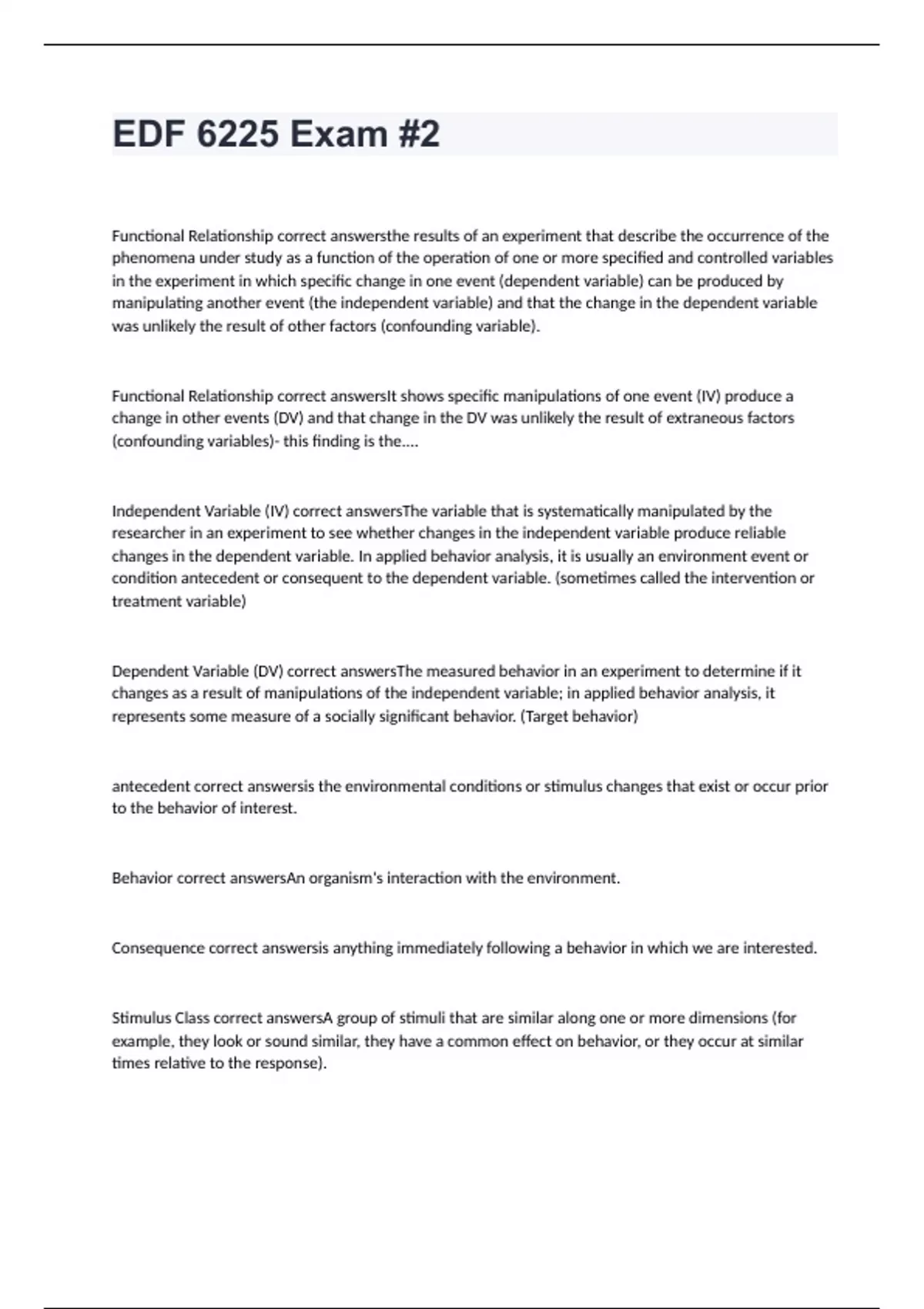 Functional Relationship correct answersthe results of an experiment that describe the occurrence of the phenomena under study as a function of the operation of one or more specified and controlled variables in the experiment in which specific change in one event (dependent variable) can be produced by manipulating another event (the independent variable) and that the change in the dependent variable was unlikely the result of other factors (confounding variable). Functional Relationship correct answersIt shows specific manipulations of one event (IV) produce a change in other events (DV) and that change in the DV was unlikely the result of extraneous factors (confounding variables)- this finding is the.... Independent Variable (IV) correct answersThe variable that is systematically manipulated by the researcher in an experiment to see whether changes in the independent variable produce reliable changes in the dependent variable. In applied behavior analysis, it is usually an environment event or condition antecedent or consequent to the dependent variable. (sometimes called the intervention or treatment variable) Dependent Variable (DV) correct answersThe measured behavior in an experiment to determine if it changes as a result of manipulations of the independent variable; in applied behavior analysis, it represents some measure of a socially significant behavior. (Target behavior) antecedent correct answersis the environmental conditions or stimulus changes that exist or occur prior to the behavior of interest. Behavior correct answersAn organism's interaction with the environment. Consequence correct answersis anything immediately following a behavior in which we are interested. Stimulus Class correct answersA group of stimuli that are similar along one or more dimensions (for example, they look or sound similar, they have a common effect on behavior, or they occur at similar times relative to the response).