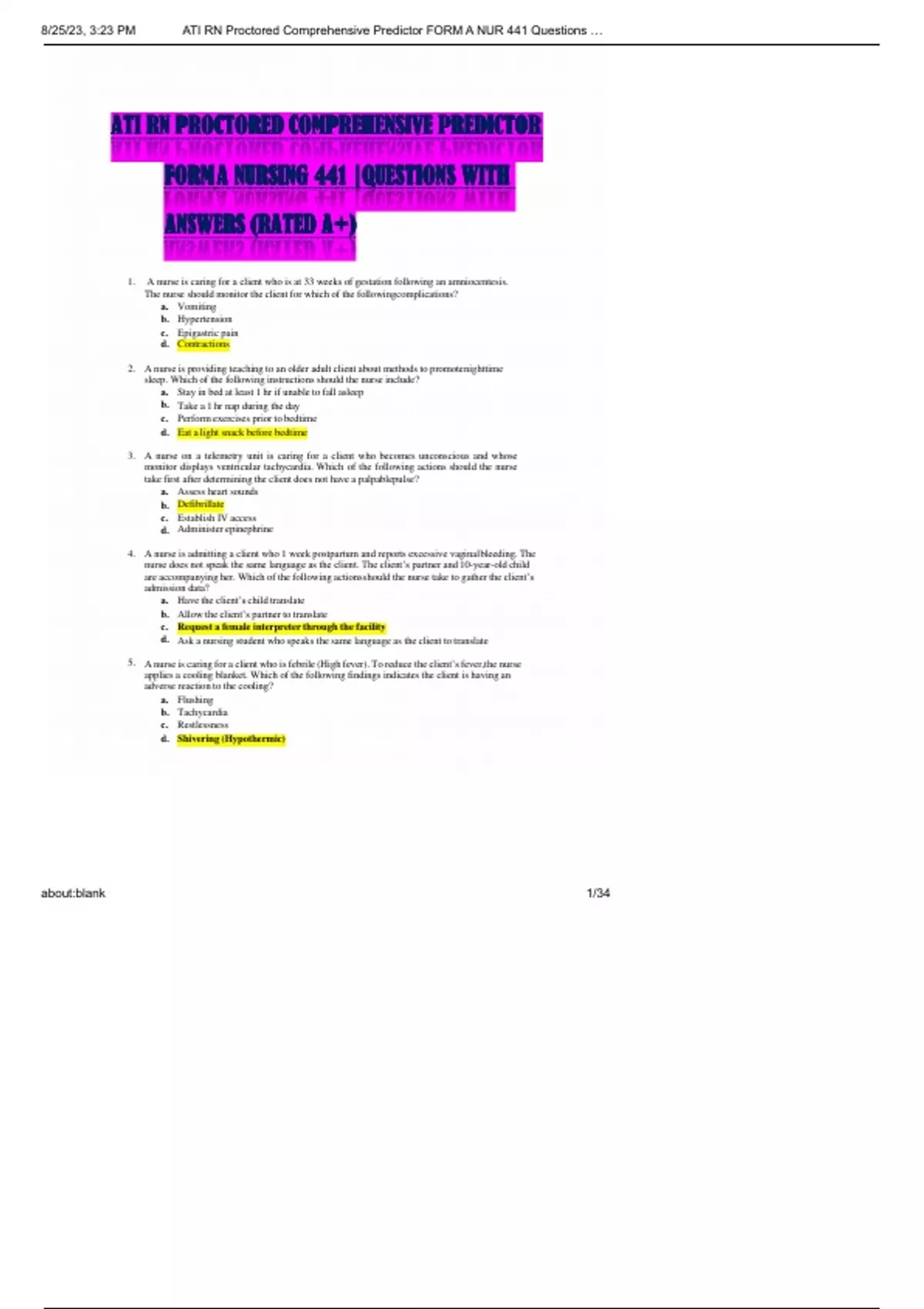 ATI RNRNRNRNRN PROCTORED COMPREHENSIVE PREDICTOR FORM A NURSING 441 |QUA QU ESTIONS WITH ANSWERS (RATED A )