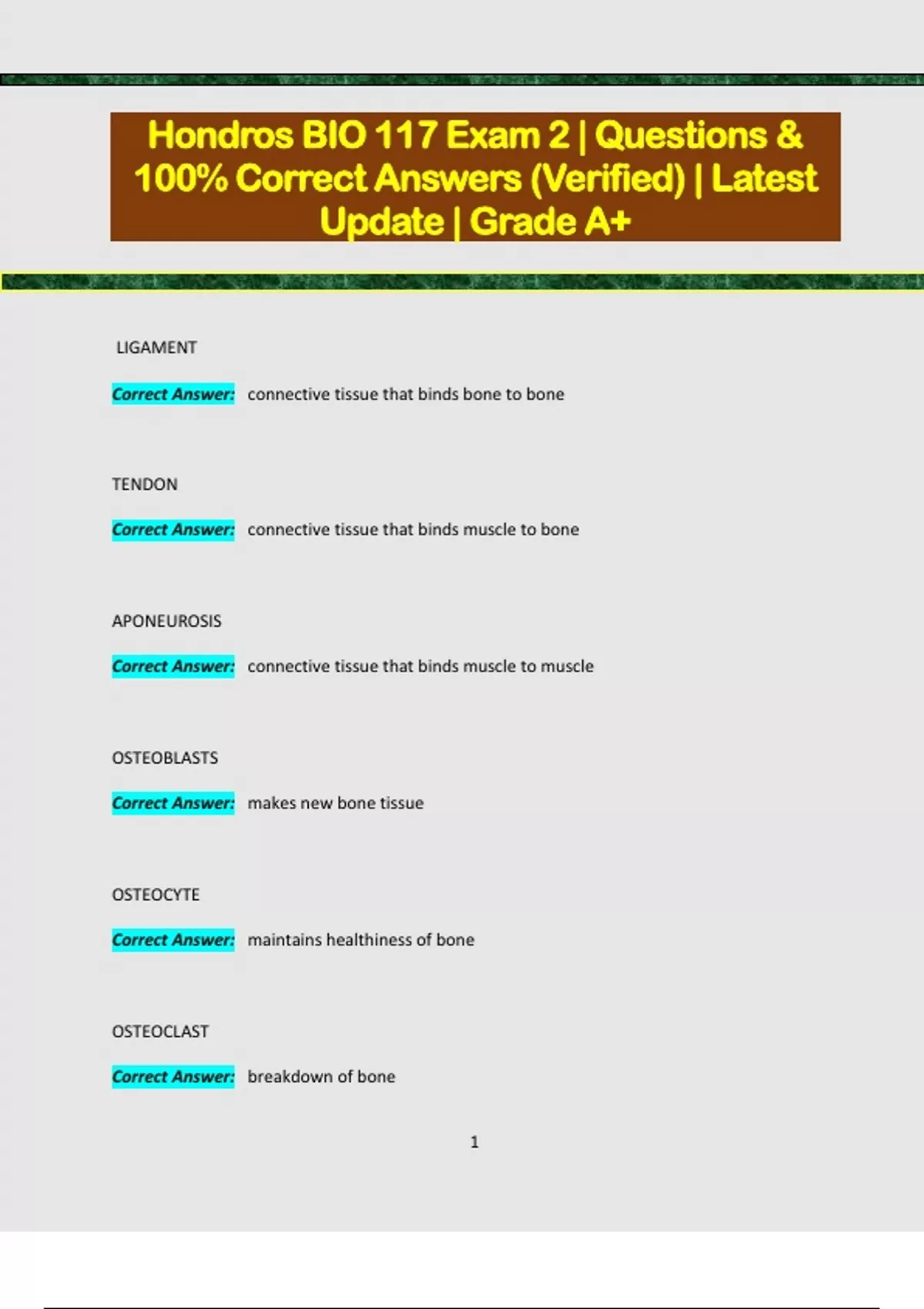 Hondros BIO 117 Exam 2 | Questions & 100% Correct Answers (Verified) | Latest Update | Grade A+ LIGAMENT Correct Answer: connective tissue that binds bone to bone TENDON Correct Answer: connective tissue that binds muscle to bone APONEUROSIS Correct Answer: connective tissue that binds muscle to muscle OSTEOBLASTS Correct Answer: makes new bone tissue OSTEOCYTE Correct Answer: maintains healthiness of bone OSTEOCLAST Correct Answer: breakdown of bone 2 PERIOSTEUM Correct Answer: covering of bone PECTORAL GIRDLE Correct Answer: clavicle and scapula PELVIC GIRDLE Correct Answer: coxal bones, sacrum, coccyx VERTEBRAE Correct Answer: cervical~7 thoracic~ lumbar~ sacral~5 coccygeal~4 EAR OSSICLES 3 Correct Answer: malleus, incus, stapes~MIS PARANASAL SINUSES Correct Answer: air filled cavities in bone