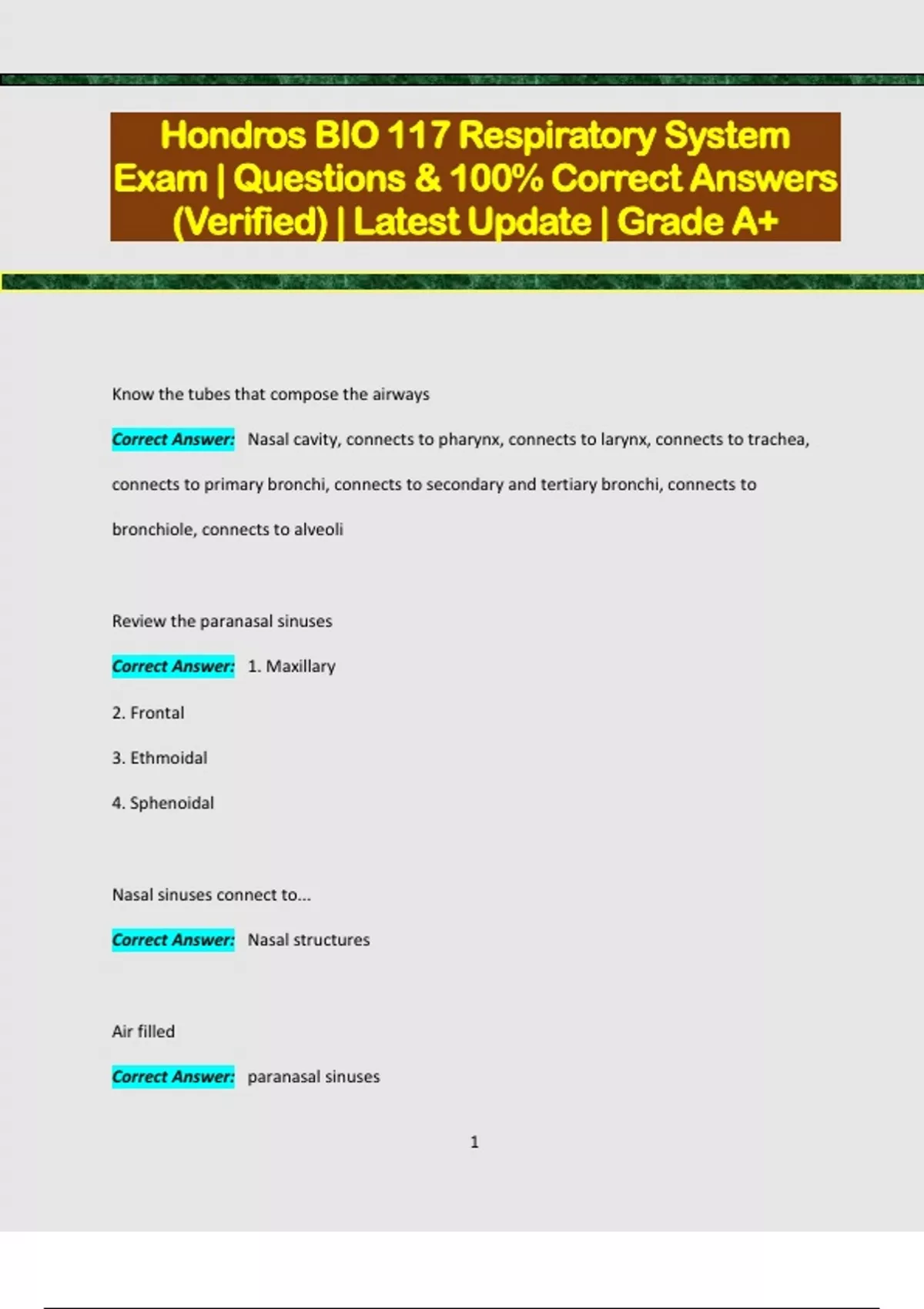 Hondros BIO 117 Respiratory System Exam | Questions & 100% Correct Answers (Verified) | Latest Update | Grade A+