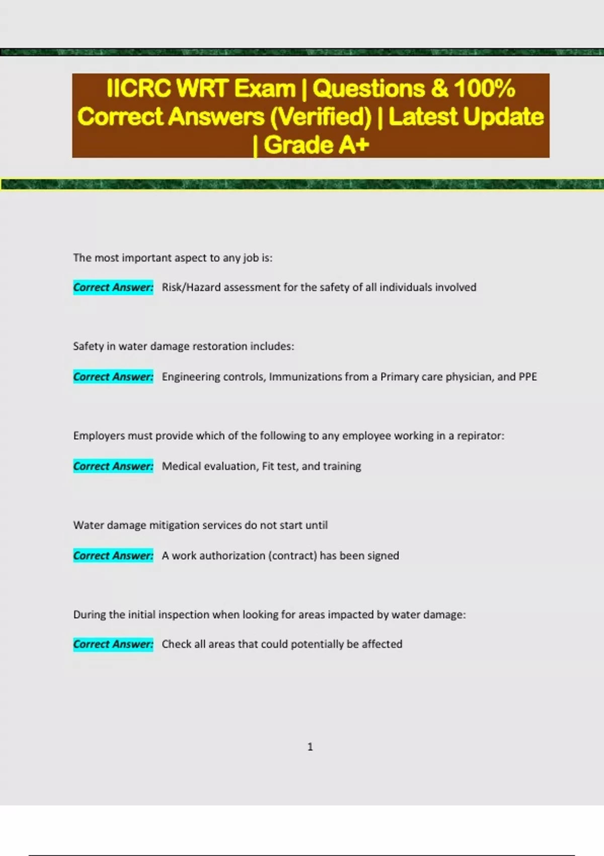 ICRC WRT Exam | Questions & 100% Correct Answers (Verified) | Latest Update | Grade A+ The most important aspect to any job is: Correct Answer: Risk/Hazard assessment for the safety of all individuals involved Safety in water damage restoration includes: Correct Answer: Engineering controls, Immunizations from a Primary care physician, and PPE Employers must provide which of the following to any employee working in a repirator: Correct Answer: Medical evaluation, Fit test, and training Water damage mitigation services do not start until Correct Answer: A work authorization (contract) has been signed During the initial inspection when looking for areas impacted by water damage: Correct Answer: Check all areas that could potentially be affected 2 Often found in older structres, lead and asbestos are hazardous materials regulated by the Federal Government (true or False) Correct Answer: True The Category of water refers to the range of contamination in water considering both its originating source and its quality after contacting materials on the jobsite. (True or False) Correct Answer: True Water that has significant degree of contamination and could cause illiness is: Correct Answer: Category 2 Water that is grossly contaminated is: Correct Answer: Category 3 If stopped from removing highly porous materials (e.g. carpet) on a Category 3 job, what should a restorer do? Correct Answer: Stop work to prevent liability Water that contains diesel fuel is: Correct Answer: regulated, Hazardous Materials or Mold 3 The three types of damage a tchnician needs to identify, document, and communicate to materially interested parties are: Correct Answer: Pre-existing, primary, and secondary Secondary damage are more likely to occur when relative humidity levels are: Correct Answer: 55% Performing a thorough extraction or multiple extractions.... Correct Answer: Reduces drying times Water extracted from a jobsite should be... Correct Answer: Disposed of according to local laws In a basement that measures 25' x 30' and has water standing at a depth of 9", how many gallons total are there? Correct Answer: 4,208 gallons 25 x 30 x (9/12 = 0.75) x 7.481 In a crawlspace that measures 12' x 15' and has water standing at a depth of 5'3", how many total gallons of water is there? Correct Answer: 12 x 15 x (5'3" = 5 3/12 = 5.25) x 7.481= 7,069 gallons 4 A moisture reading obtained from an unaffected material that allows the restorer to set drying goals for the affected structure is the___ Correct Answer: Dry standard