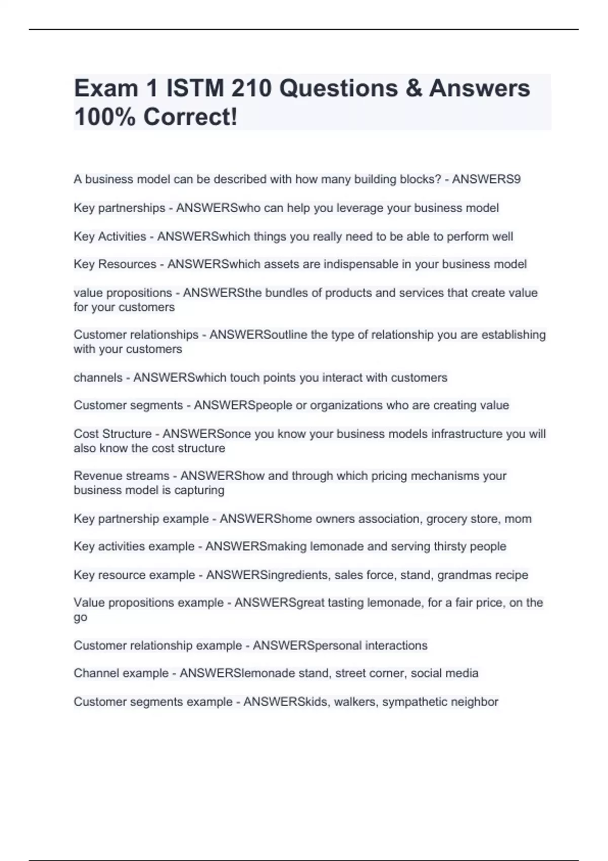 A business model can be described with how many building blocks? - ANSWERS9 Key partnerships - ANSWERSwho can help you leverage your business model Key Activities - ANSWERSwhich things you really need to be able to perform well Key Resources - ANSWERSwhich assets are indispensable in your business model value propositions - ANSWERSthe bundles of products and services that create value for your customers Customer relationships - ANSWERSoutline the type of relationship you are establishing with your customers channels - ANSWERSwhich touch points you interact with customers Customer segments - ANSWERSpeople or organizations who are creating value Cost Structure - ANSWERSonce you know your business models infrastructure you will also know the cost structure Revenue streams - ANSWERShow and through which pricing mechanisms your business model is capturing Key partnership example - ANSWERShome owners association, grocery store, mom Key activities example - ANSWERSmaking lemonade and serving thirsty people Key resource example - ANSWERSingredients, sales force, stand, grandmas recipe Value propositions example - ANSWERSgreat tasting lemonade, for a fair price, on the go Customer relationship example - ANSWERSpersonal interactions Channel example - ANSWERSlemonade stand, street corner, social media Customer segments example - ANSWERSkids, walkers, sympathetic neighbor Cost structure example - ANSWERSIngredients, stand materials, employees (neighbors kid),flyers, cups, city permit Revenue Streams example - ANSWERSSales, gifts, donations 2^0 - ANSWERS1 2^1
