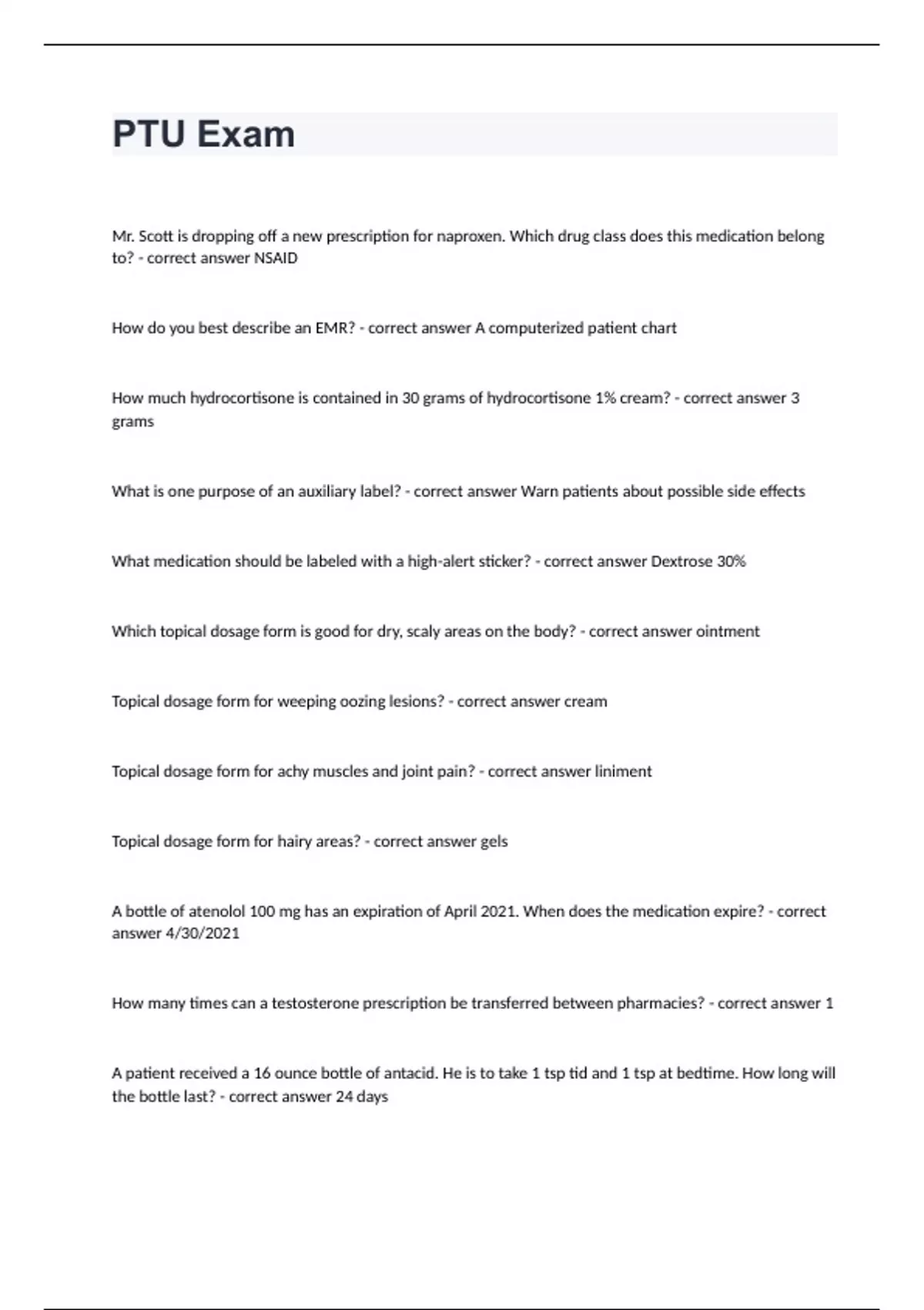 PTU Exam Mr. Scott is dropping off a new prescription for naproxen. Which drug class does this medication belong to? - correct answer NSAID How do you best describe an EMR? - correct answer A computerized patient chart How much hydrocortisone is contained in 30 grams of hydrocortisone 1% cream? - correct answer 3 grams What is one purpose of an auxiliary label? - correct answer Warn patients about possible side effects What medication should be labeled with a high-alert sticker? - correct answer Dextrose 30% Which topical dosage form is good for dry, scaly areas on the body? - correct answer ointment Topical dosage form for weeping oozing lesions? - correct answer cream Topical dosage form for achy muscles and joint pain? - correct answer liniment Topical dosage form for hairy areas? - correct answer gels A bottle of atenolol 100 mg has an expiration of April 2021. When does the medication expire? - correct answer 4/30/2021 How many times can a testosterone prescription be transferred between pharmacies? - correct answer 1 A patient received a 16 ounce bottle of antacid. He is to take 1 tsp tid and 1 tsp at bedtime. How long will the bottle last? - correct answer 24 days