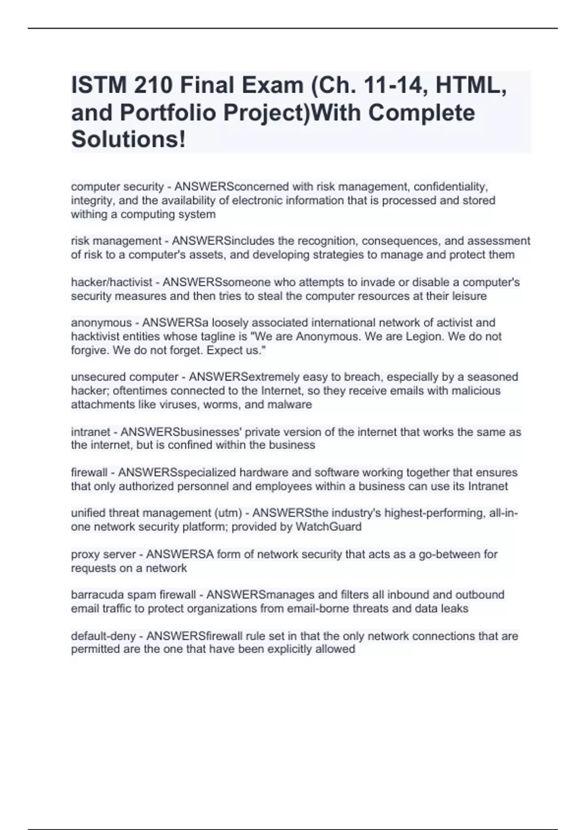 computer security - ANSWERSconcerned with risk management, confidentiality, integrity, and the availability of electronic information that is processed and stored withing a computing system risk management - ANSWERSincludes the recognition, consequences, and assessment of risk to a computer's assets, and developing strategies to manage and protect them hacker/hactivist - ANSWERSsomeone who attempts to invade or disable a computer's security measures and then tries to steal the computer resources at their leisure anonymous - ANSWERSa loosely associated international network of activist and hacktivist entities whose tagline is "We are Anonymous. We are Legion. We do not forgive. We do not forget. Expect us." unsecured computer - ANSWERSextremely easy to breach, especially by a seasoned hacker; oftentimes connected to the Internet, so they receive emails with malicious attachments like viruses, worms, and malware intranet - ANSWERSbusinesses' private version of the internet that works the same as the internet, but is confined within the business firewall - ANSWERSspecialized hardware and software working together that ensures that only authorized personnel and employees within a business can use its Intranet unified threat management (utm) - ANSWERSthe industry's highest-performing, all-in-one network security platform; provided by WatchGuard proxy server - ANSWERSA form of network security that acts as a go-between for requests on a network barracuda spam firewall - ANSWERSmanages and filters all inbound and outbound email traffic to protect organizations from email-borne threats and data leaks default-deny - ANSWERSfirewall rule set in that the only network connections that are permitted are the one that have been explicitly allowed default-allow - ANSWERSrule set in that all traffic is allowed unless it has been