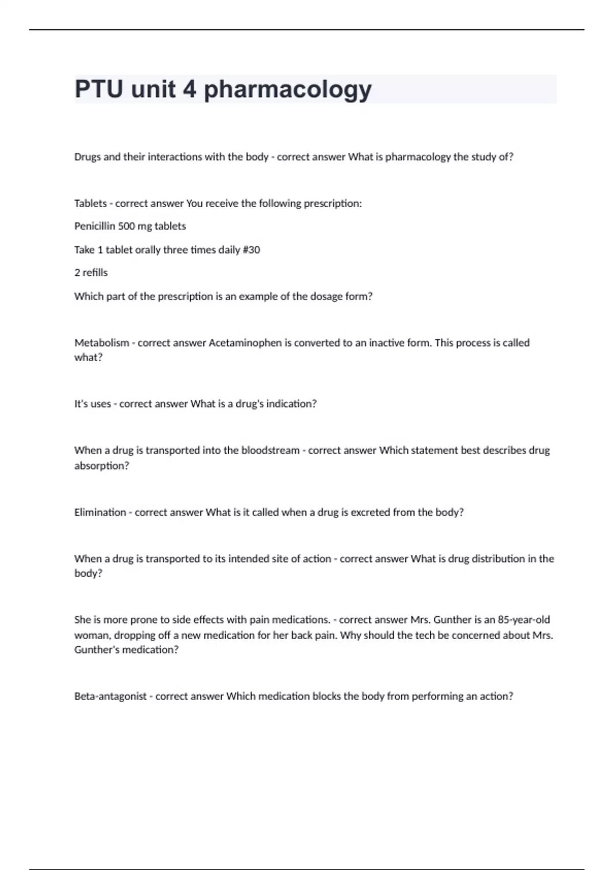 PTU unit 4 pharmacologyDrugs and their interactions with the body - correct answer What is pharmacology the study of? Tablets - correct answer You receive the following prescription: Penicillin 500 mg tablets Take 1 tablet orally three times daily #30 2 refills Which part of the prescription is an example of the dosage form? Metabolism - correct answer Acetaminophen is converted to an inactive form. This process is called what? It's uses - correct answer What is a drug's indication? When a drug is transported into the bloodstream - correct answer Which statement best describes drug absorption? Elimination - correct answer What is it called when a drug is excreted from the body? When a drug is transported to its intended site of action - correct answer What is drug distribution in the body? She is more prone to side effects with pain medications. - correct answer Mrs. Gunther is an 85-year-old woman, dropping off a new medication for her back pain. Why should the tech be concerned about Mrs. Gunther's medication? Beta-antagonist - correct answer Which medication blocks the body from performing an action? Pharmacokinetics - correct answer The study of how the body interacts with a drug is called: Alpha-agonist - correct answer Which medication prompts the body to start an action? It helps prepare technicians for certification exams - correct answer How does the knowledge of pharmacology bring value to a pharmacy technician's role? Side effect - correct answer What is dizziness an example of when taking a beta-blocker? drug class - correct answer Benzodiazepine is an example of a(n):