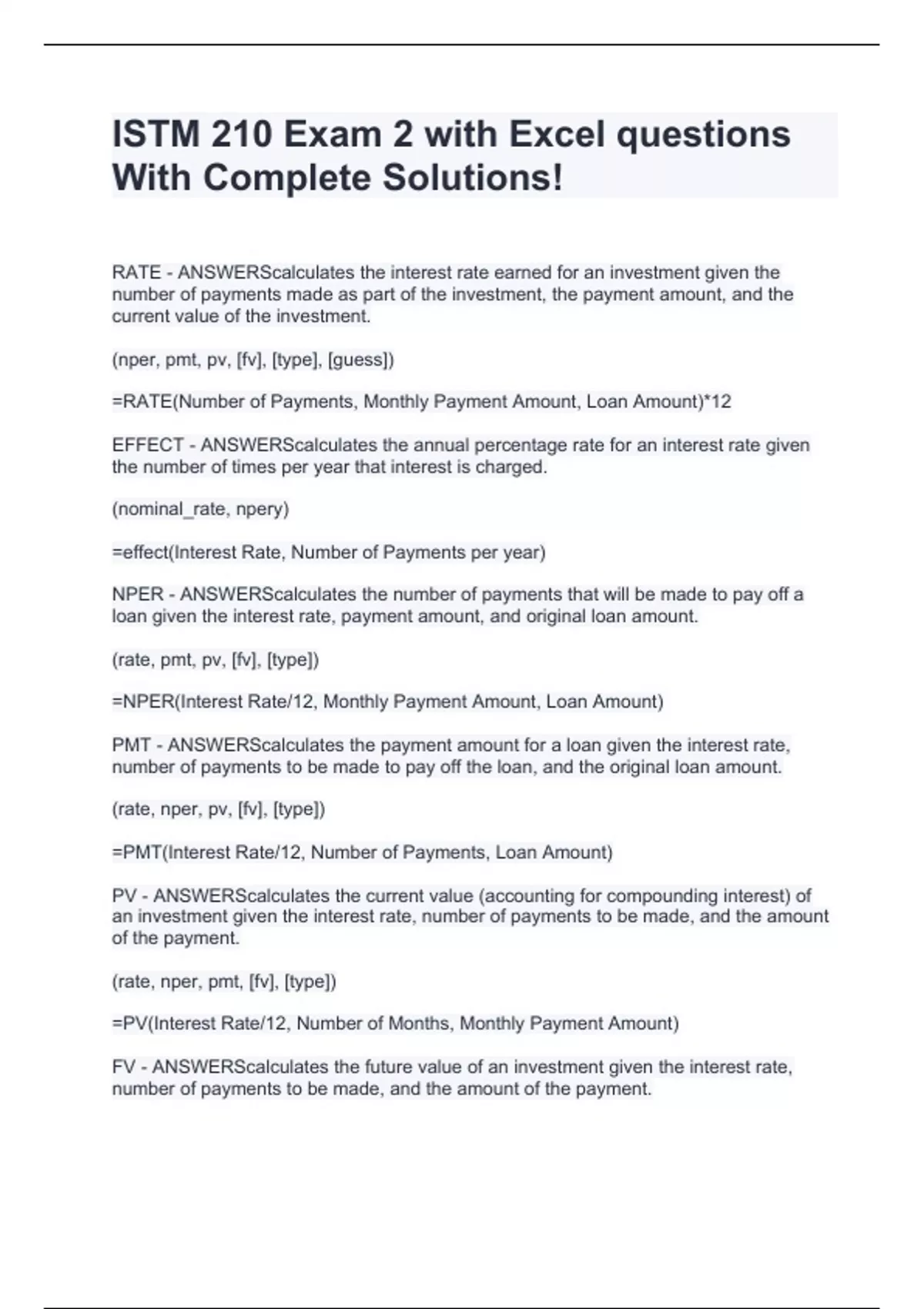 RATE - ANSWERScalculates the interest rate earned for an investment given the number of payments made as part of the investment, the payment amount, and the current value of the investment. (nper, pmt, pv, [fv], [type], [guess]) =RATE(Number of Payments, Monthly Payment Amount, Loan Amount)*12 EFFECT - ANSWERScalculates the annual percentage rate for an interest rate given the number of times per year that interest is charged. (nominal_rate, npery) =effect(Interest Rate, Number of Payments per year) NPER - ANSWERScalculates the number of payments that will be made to pay off a loan given the interest rate, payment amount, and original loan amount. (rate, pmt, pv, [fv], [type]) =NPER(Interest Rate/12, Monthly Payment Amount, Loan Amount) PMT - ANSWERScalculates the payment amount for a loan given the interest rate, number of payments to be made to pay off the loan, and the original loan amount. (rate, nper, pv, [fv], [type]) =PMT(Interest Rate/12, Number of Payments, Loan Amount) PV - ANSWERScalculates the current value (accounting for compounding interest) of an investment given the interest rate, number of payments to be made, and the amount of the payment. (rate, nper, pmt, [fv], [type]) =PV(Interest Rate/12, Number of Months, Monthly Payment Amount) FV - ANSWERScalculates the future value of an investment given the interest rate, n