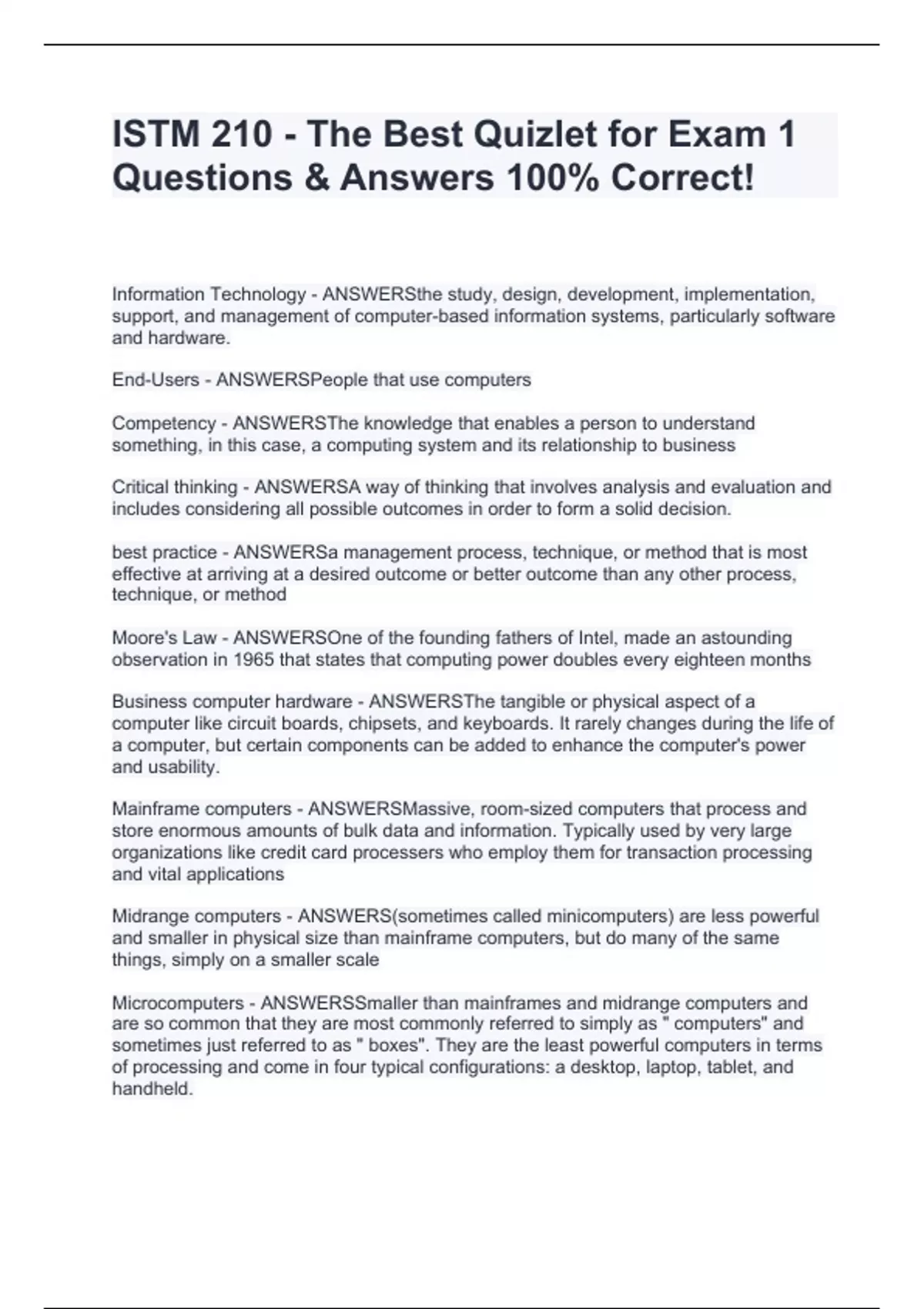 Information Technology - ANSWERSthe study, design, development, implementation, support, and management of computer-based information systems, particularly software and hardware. End-Users - ANSWERSPeople that use computers Competency - ANSWERSThe knowledge that enables a person to understand something, in this case, a computing system and its relationship to business Critical thinking - ANSWERSA way of thinking that involves analysis and evaluation and includes considering all possible outcomes in order to form a solid decision. best practice - ANSWERSa management process, technique, or method that is most effective at arriving at a desired outcome or better outcome than any other process, technique, or method Moore's Law - ANSWERSOne of the founding fathers of Intel, made an astounding observation in 1965 that states that computing power doubles every eighteen months Business computer hardware - ANSWERSThe tangible or physical aspect of a computer like circuit boards, chipsets, and keyboards. It rarely changes during the life of a computer, but certain components can be added to enhance the computer's power and usability. Mainframe computers - ANSWERSMassive, room-sized computers that process and store enormous amounts of bulk data and information. Typically used by very large organizations like credit card processers who employ them for transaction processing and vital applications Midrange computers - ANSWERS(sometimes called minicomputers) are less powerful and smaller in physical size than mainframe computers, but do many of the same things, simply on a smaller scale Microcomputers - ANSWERSSmaller than mainframes and midrange computers and are so common that they are most commonly referred to simply as " computers" and sometimes just referred to as " boxes". They are the least powerful computers in terms of processing and come in four typical configurations: a desktop, laptop, tablet, and