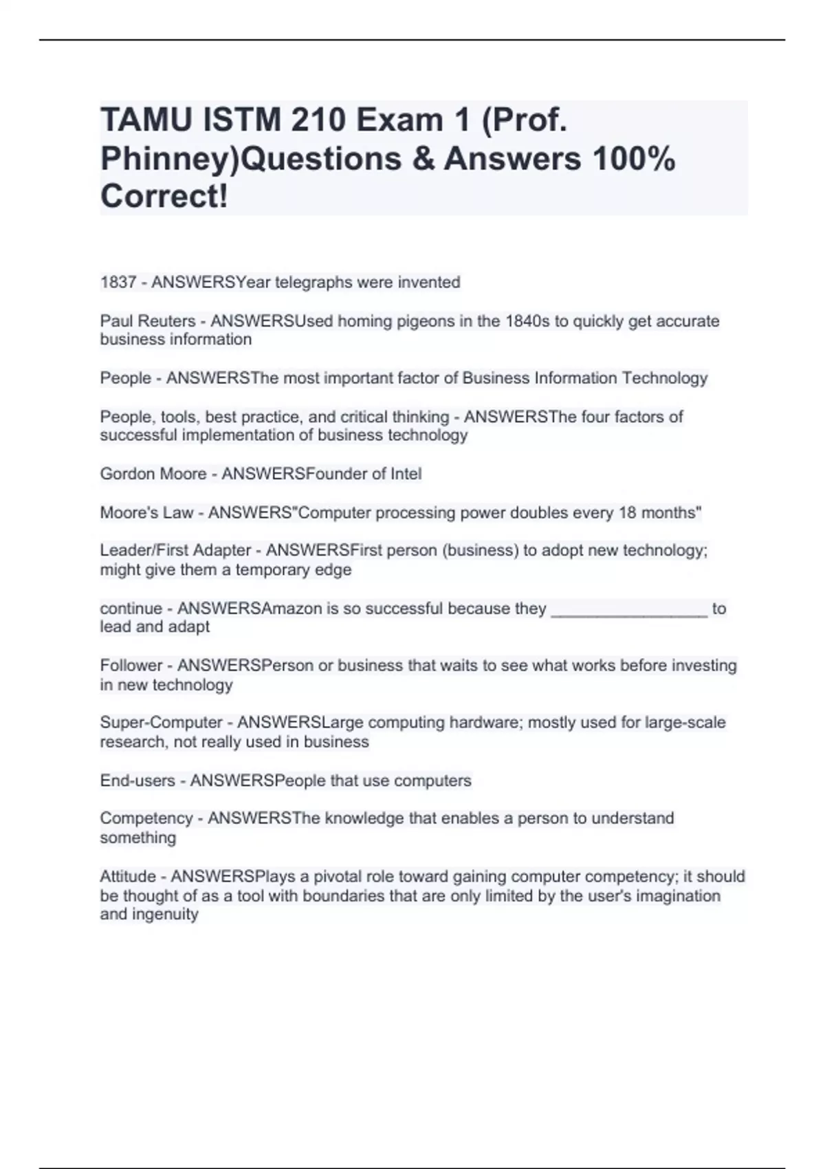 1837 - ANSWERSYear telegraphs were invented Paul Reuters - ANSWERSUsed homing pigeons in the 1840s to quickly get accurate business information People - ANSWERSThe most important factor of Business Information Technology People, tools, best practice, and critical thinking - ANSWERSThe four factors of successful implementation of business technology Gordon Moore - ANSWERSFounder of Intel Moore's Law - ANSWERS"Computer processing power doubles every 18 months" Leader/First Adapter - ANSWERSFirst person (business) to adopt new technology; might give them a temporary edge continue - ANSWERSAmazon is so successful because they _________________ to lead and adapt Follower - ANSWERSPerson or business that waits to see what works before investing in new technology Super-Computer - ANSWERSLarge computing hardware; mostly used for large-scale research, not really used in business End-users - ANSWERSPeople that use computers Competency - ANSWERSThe knowledge that enables a person to understand something Attitude - ANSWERSPlays a pivotal role toward gaining computer competency; it should be thought of as a tool with boundaries that are only limited by the user's imagination and ingenuity