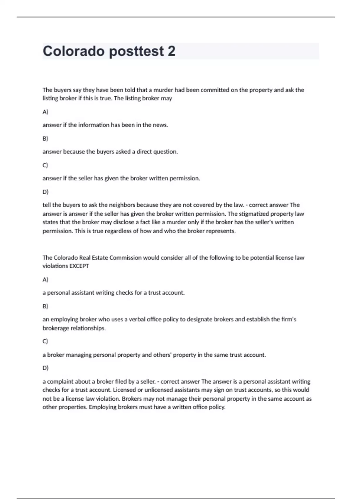 Colorado posttest 2 The buyers say they have been told that a murder had been committed on the property and ask the listing broker if this is true. The listing broker may A) answer if the information has been in the news. B) answer because the buyers asked a direct question. C) answer if the seller has given the broker written permission. D) tell the buyers to ask the neighbors because they are not covered by the law. - correct answer The answer is answer if the seller has given the broker written permission. The stigmatized property law states that the broker may disclose a fact like a murder only if the broker has the seller's written permission. This is true regardless of how and who the broker represents. The Colorado Real Estate Commission would consider all of the following to be potential license law violations EXCEPT A) a personal assistant writing checks for a trust account. B) an employing broker who uses a verbal office policy to designate brokers and establish the firm's brokerage relationships. C) a broker managing personal property and others' property in the same trust account. D) a complaint about a broker filed by a seller. - correct answer The answer is a personal assistant writing checks for a trust account. Licensed or unlicensed assistants may sign on trust accounts, so this would not be a license law violation. Brokers may not manage their personal property in the same account as other properties. Employing brokers must have a written office policy. Renewal of a Colorado license requires completion of continuing education. How many hours of Annual Commission Updates (ACU) are required each year? A) 3 B) 4 C) 8 D) 21 - correct answer The answer is 4. All active brokers are required to have a total of 24 hours of continuing education every three years: 4 hours of ACU (Annual Commission Updates) each year for a total of 12 hours, along with 12 hours of elective CE education. All broker licenses need to be renewed no later than A) the day before the anniversary date. B) the birthday of the broker. C) the anniversary date of passing the state licensing exam. D) the anniversary date. - correct answer The answer is the anniversary date. All broker's licenses expire and need to be renewed on the anniversary of when the license became active, not when the broker passed the exam. An inactive broker A) should carry errors and omissions insurance. B) will have to take and pass the state exam in order to activate the license. C) may work for a new home sales development.