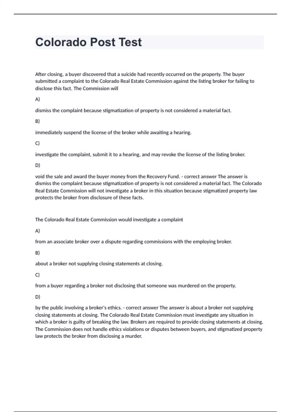 Colorado Post TestAfter closing, a buyer discovered that a suicide had recently occurred on the property. The buyer submitted a complaint to the Colorado Real Estate Commission against the listing broker for failing to disclose this fact. The Commission will A) dismiss the complaint because stigmatization of property is not considered a material fact. B) immediately suspend the license of the broker while awaiting a hearing. C) investigate the complaint, submit it to a hearing, and may revoke the license of the listing broker. D) void the sale and award the buyer money from the Recovery Fund. - correct answer The answer is dismiss the complaint because stigmatization of property is not considered a material fact. The Colorado Real Estate Commission will not investigate a broker in this situation because stigmatized property law protects the broker from disclosure of these facts. The Colorado Real Estate Commission would investigate a complaint A) from an associate broker over a dispute regarding commissions with the employing broker. B) about a broker not supplying closing statements at closing. C) from a buyer regarding a broker not disclosing that someone was murdered on the property. D) by the public involving a broker's ethics. - correct answer The answer is about a broker not supplying closing statements at closing. The Colorado Real Estate Commission must investigate any situation in which a broker is guilty of breaking the law. Brokers are required to provide closing statements at closing. The Commission does not handle ethics violations or disputes between buyers, and stigmatized property law protects the broker from disclosing a murder. A broker renewing a Colorado license is required to have how many hours of continuing education over what period of time? A) 36 hours over 4 years B) 24 hours over 3 years C) 8 hours over 2 years D) 24 hours over 4 years - correct answer The answer is 24 hours over 3 years. The law requires a total of 24 hours of continuing education, of which 12 must be from Annual Commission Update courses, with all education completed over 3 years. An active broker may fulfill the continuing education requirement for a three-year renewal cycle by any of the following EXCEPT A) taking 24 hours of approved continuing education courses. B) taking and passing the state section of the broker licensing exam. C) taking the national section of the broker licensing exam. D) completing 12 hours of commission updates and 12 elective hours of approved continuing education. - correct answer The answer is taking the national section of the broker licensing exam. The broker can take and pass the state portion of the licensing exam or take 24 hours of continuing education by completing 12 hours of updates and 12 hours of elective courses to meet the continuing education requirement. Taking the national portion of the licensing exam will not give the broker any credit. An inactive broker may do all of the following EXCEPT A) complete a contract form once the broker has given pricing information. B)