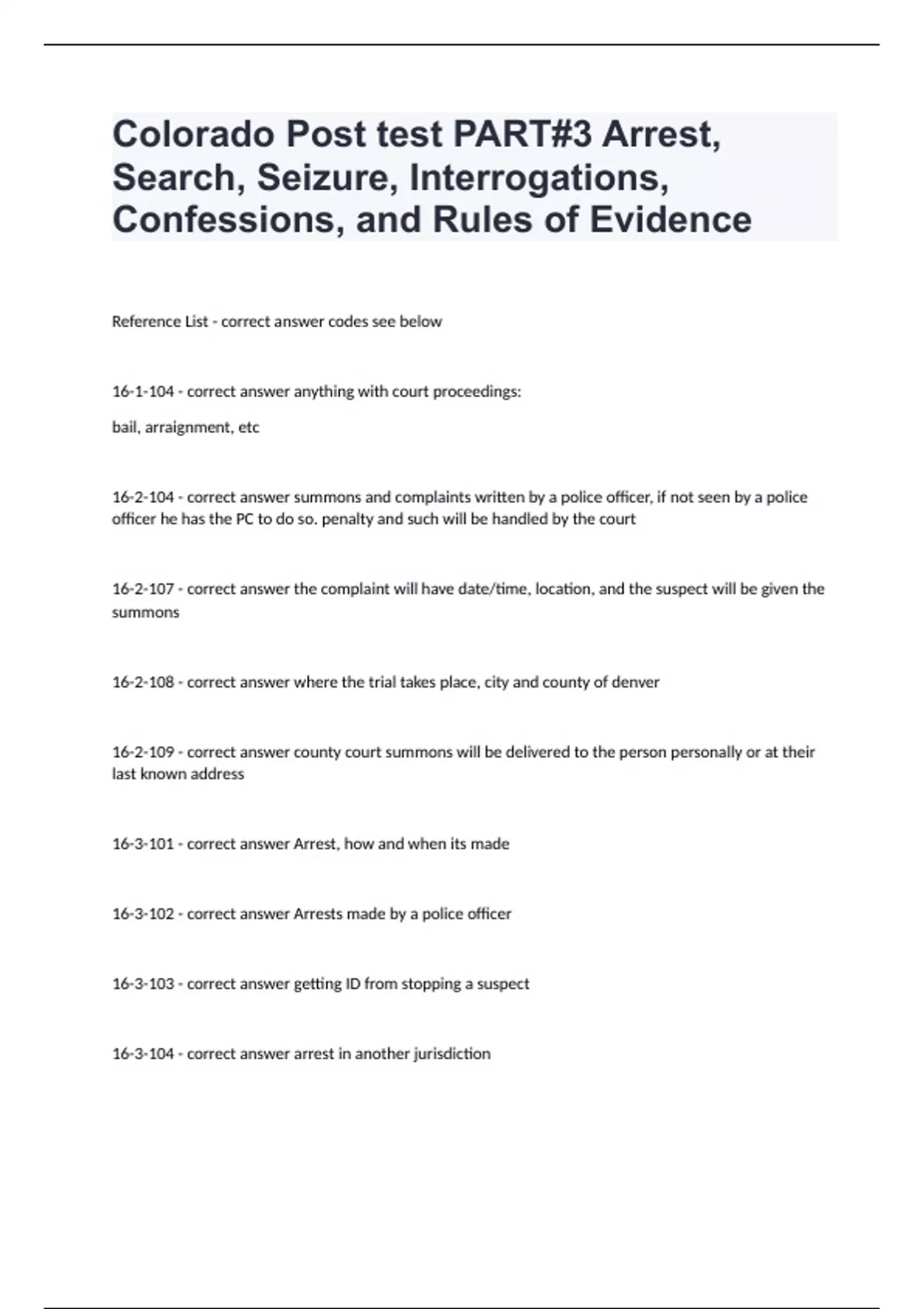 Colorado Post test PART#3 Arrest, Search, Seizure, Interrogations, Confessions, and Rules of EvidenceReference List - correct answer codes see below 16-1-104 - correct answer anything with court proceedings: bail, arraignment, etc 16-2-104 - correct answer summons and complaints written by a police officer, if not seen by a police officer he has the PC to do so. penalty and such will be handled by the court 16-2-107 - correct answer the complaint will have date/time, location, and the suspect will be given the summons 16-2-108 - correct answer where the trial takes place, city and county of denver 16-2-109 - correct answer county court summons will be delivered to the person personally or at their last known address 16-3-101 - correct answer Arrest, how and when its made 16-3-102 - correct answer Arrests made by a police officer 16-3-103 - correct answer getting ID from stopping a suspect 16-3-104 - correct answer arrest in another jurisdiction