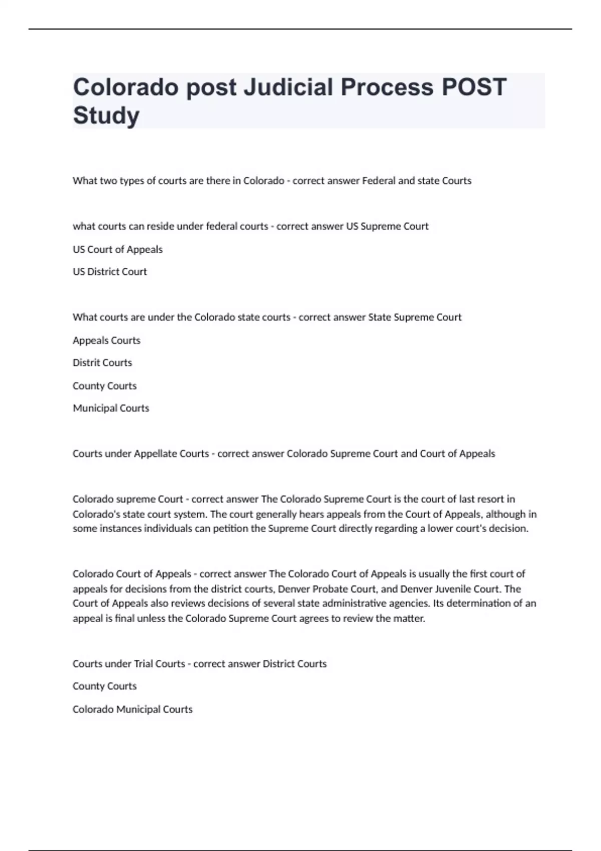 Colorado post Judicial Process POST StudyWhat two types of courts are there in Colorado - correct answer Federal and state Courts what courts can reside under federal courts - correct answer US Supreme Court US Court of Appeals US District Court What courts are under the Colorado state courts - correct answer State Supreme Court Appeals Courts Distrit Courts County Courts Municipal Courts Courts under Appellate Courts - correct answer Colorado Supreme Court and Court of Appeals Colorado supreme Court - correct answer The Colorado Supreme Court is the court of last resort in Colorado's state court system. The court generally hears appeals from the Court of Appeals, although in some instances individuals can petition the Supreme Court directly regarding a lower court's decision. Colorado Court of Appeals - correct answer The Colorado Court of Appeals is usually the first court of appeals for decisions from the district courts, Denver Probate Court, and Denver Juvenile Court. The Court of Appeals also reviews decisions of several state administrative agencies. Its determination of an appeal is final unless the Colorado Supreme Court agrees to review the matter. Courts under Trial Courts - correct answer District Courts County Courts