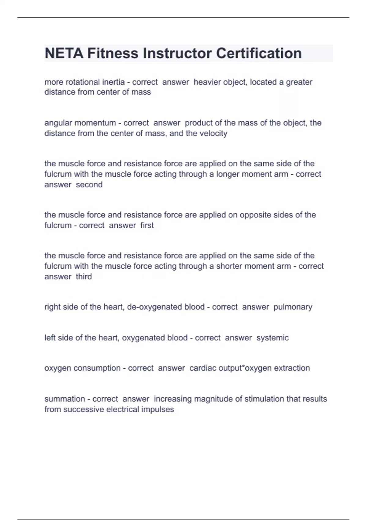 NETA Fitness Instructor Certification Study Guide Questions 2024. more rotational inertia - correct answer heavier object, located a greater distance from center of mass angular momentum - correct answer product of the mass of the object, the distance from the center of mass, and the velocity the muscle force and resistance force are applied on the same side of the fulcrum with the muscle force acting through a longer moment arm - correct answer second the muscle force and resistance force are applied on opposite sides of the fulcrum - correct answer first the muscle force and resistance force are applied on the same side of the fulcrum with the muscle force acting through a shorter moment arm - correct answer third right side of the heart, de-oxygenated blood - correct answer pulmonary left side of the heart, oxygenated blood - correct answer systemic oxygen consumption - correct answer cardiac output*oxygen extraction summation - correct answer increasing magnitude of stimulation that results from successive electrical impulses