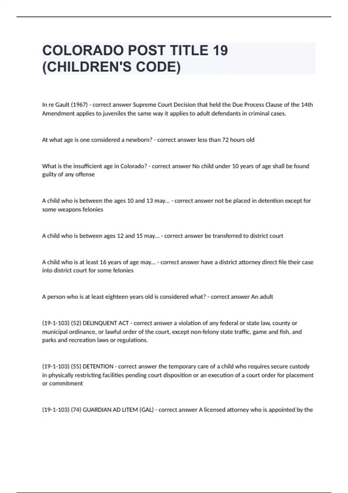 COLORADO POST TITLE 19 (CHILDREN'S CODE)In re Gault (1967) - correct answer Supreme Court Decision that held the Due Process Clause of the 14th Amendment applies to juveniles the same way it applies to adult defendants in criminal cases. At what age is one considered a newborn? - correct answer less than 72 hours old What is the insufficient age in Colorado? - correct answer No child under 10 years of age shall be found guilty of any offense A child who is between the ages 10 and 13 may... - correct answer not be placed in detention except for some weapons felonies A child who is between ages 12 and 15 may... - correct answer be transferred to district court A child who is at least 16 years of age may... - correct answer have a district attorney direct file their case into district court for some felonies A person who is at least eighteen years old is considered what? - correct answer An adult (19-1-103) (52) DELINQUENT ACT - correct answer a violation of any federal or state law, county or municipal ordinance, or lawful order of the court, except non-felony state traffic, game and fish, and parks and recreation laws or regulations. (19-1-103) (55) DETENTION - correct answer the temporary care of a child who requires secure custody in physically restricting facilities pending court disposition or an execution of a court order for placement or commitment (19-1-103) (74) GUARDIAN AD LITEM (GAL) - correct answer A licensed attorney who is appointed by the