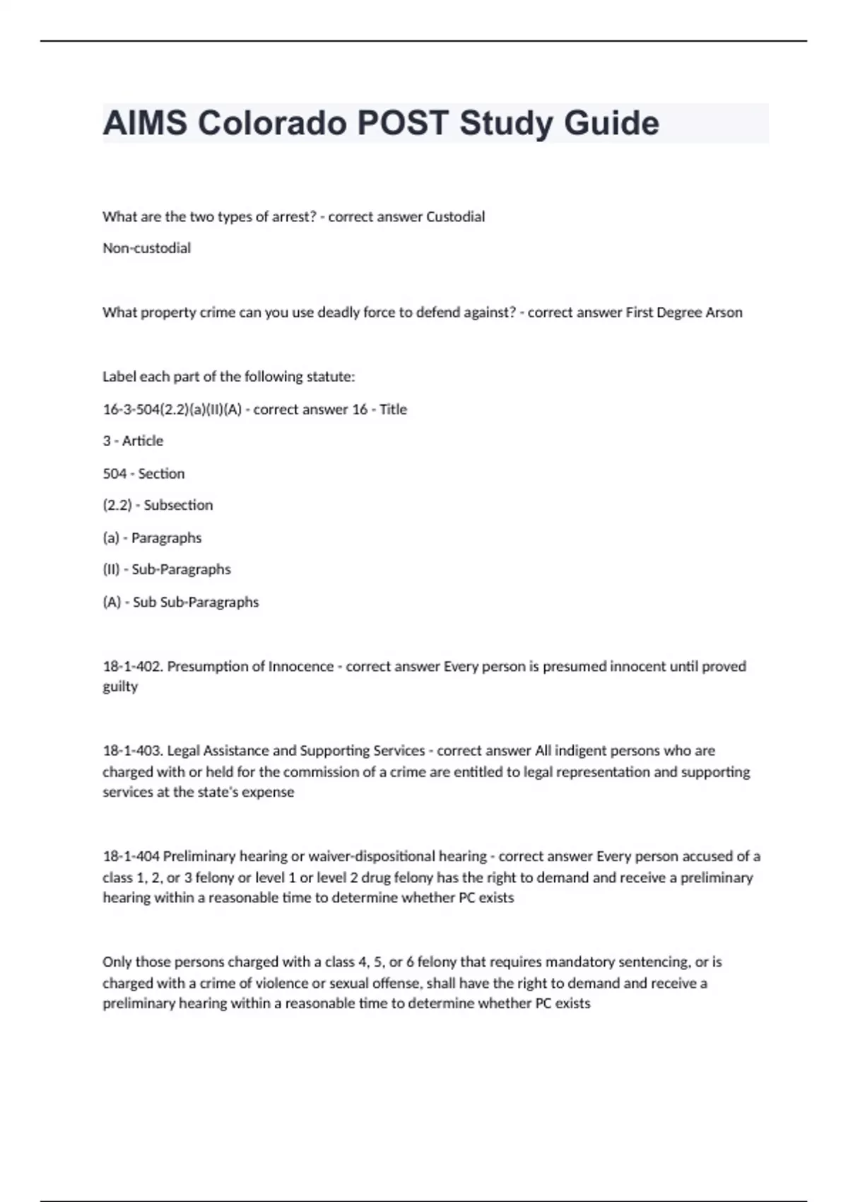 AIMS Colorado POST Study GuideWhat are the two types of arrest? - correct answer Custodial Non-custodial What property crime can you use deadly force to defend against? - correct answer First Degree Arson Label each part of the following statute: 16-3-504(2.2)(a)(II)(A) - correct answer 16 - Title 3 - Article 504 - Section (2.2) - Subsection (a) - Paragraphs (II) - Sub-Paragraphs (A) - Sub Sub-Paragraphs 18-1-402. Presumption of Innocence - correct answer Every person is presumed innocent until proved guilty 18-1-403. Legal Assistance and Supporting Services - correct answer All indigent persons who are charged with or held for the commission of a crime are entitled to legal representation and supporting services at the state's expense 18-1-404 Preliminary hearing or waiver-dispositional hearing - correct answer Every person accused of a class 1, 2, or 3 felony or level 1 or level 2 drug felony has the right to demand and receive a preliminary hearing within a reasonable time to determine whether PC exists Only those persons charged with a class 4, 5, or 6 felony that requires mandatory sentencing, or is charged with a crime of violence or sexual offense, shall have the right to demand and receive a preliminary hearing within a reasonable time to determine whether PC exists