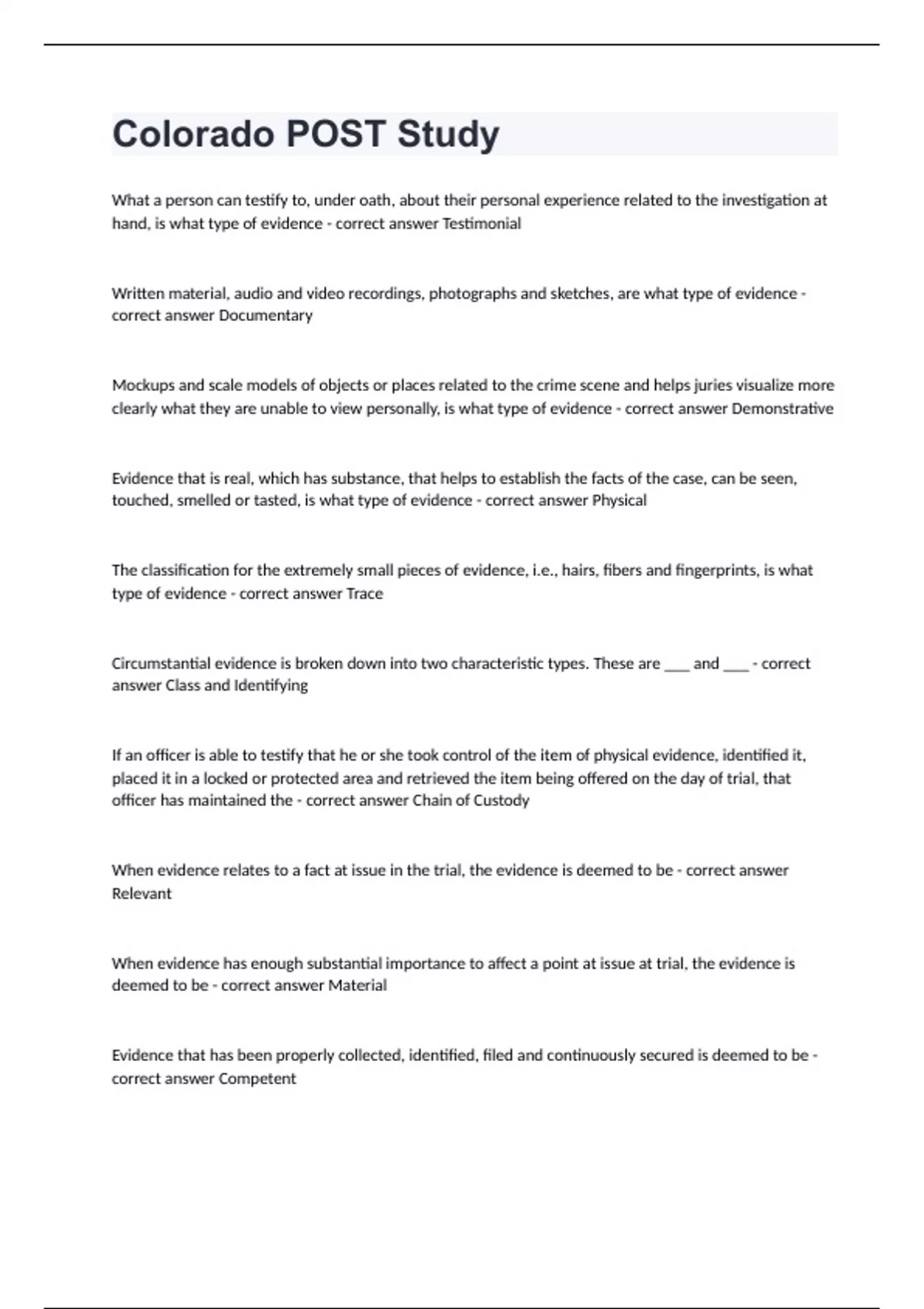 Colorado POST StudyWhat a person can testify to, under oath, about their personal experience related to the investigation at hand, is what type of evidence - correct answer Testimonial Written material, audio and video recordings, photographs and sketches, are what type of evidence - correct answer Documentary Mockups and scale models of objects or places related to the crime scene and helps juries visualize more clearly what they are unable to view personally, is what type of evidence - correct answer Demonstrative Evidence that is real, which has substance, that helps to establish the facts of the case, can be seen, touched, smelled or tasted, is what type of evidence - correct answer Physical The classification for the extremely small pieces of evidence, i.e., hairs, fibers and fingerprints, is what type of evidence - correct answer Trace Circumstantial evidence is broken down into two characteristic types. These are ___ and ___ - correct answer Class and Identifying If an officer is able to testify that he or she took control of the item of physical evidence, identified it, placed it in a locked or protected area and retrieved the item being offered on the day of trial, that officer has maintained the - correct answer Chain of Custody When evidence relates to a fact at issue in the trial, the evidence is deemed to be - correct answer Relevant When evidence has enough substantial importance to affect a point at issue at trial, the evidence is deemed to be - correct answer Material Evidence that has been properly collected, identified, filed and continuously secured is deemed to be - correct answer Competent