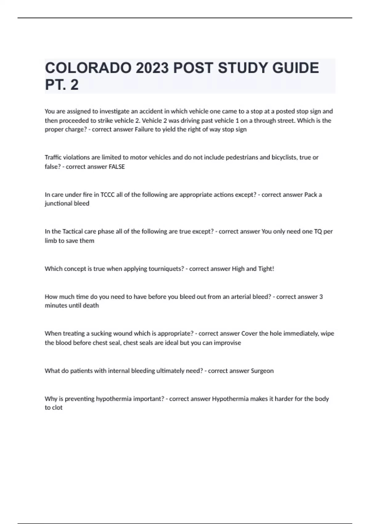 COLORADO 2023 POST STUDY GUIDE PT. 2You are assigned to investigate an accident in which vehicle one came to a stop at a posted stop sign and then proceeded to strike vehicle 2. Vehicle 2 was driving past vehicle 1 on a through street. Which is the proper charge? - correct answer Failure to yield the right of way stop sign Traffic violations are limited to motor vehicles and do not include pedestrians and bicyclists, true or false? - correct answer FALSE In care under fire in TCCC all of the following are appropriate actions except? - correct answer Pack a junctional bleed In the Tactical care phase all of the following are true except? - correct answer You only need one TQ per limb to save them Which concept is true when applying tourniquets? - correct answer High and Tight! How much time do you need to have before you bleed out from an arterial bleed? - correct answer 3 minutes until death When treating a sucking wound which is appropriate? - correct answer Cover the hole immediately, wipe the blood before chest seal, chest seals are ideal but you can improvise What do patients with internal bleeding ultimately need? - correct answer Surgeon Why is preventing hypothermia important? - correct answer Hypothermia makes it harder for the body to clot Why aren't junctional bleeds treated under care under fire? - correct answer They require too much man power and time to expose the team from incoming fire Witnesses are permitted to offer testimony on any subject, what is the most appropriate answer? - correct answer No the rules of evidence contain many restrictions on what is admissible evidence and what is excluded Which of the following is considered a dangerous weapon in colorado? - correct answer Ballistic Knife T/F A 21 year old out of state can only possess a quarter ounce of MJ? - correct answer False Which of the following is not required to underage drinking to receive immunity in reporting? - correct answer Testified in court against the underage person who needed attention T/F Felony child abuse resulting in death can have a negligent state? - correct answer True An officer was testifying in court the DA asked him to draw a diagram of a crime scene showing where evidence was located, the diagram is best described as what type of evidence? - correct answer Demonstrative Evidence Harassment: - correct answer A person commits harassment if, with intent to harass, annoy, or alarm another person he or she; shoves, strikes, kicks, or otherwise touches a person or subjects him to physical contact. Or uses obscene language in a public place or gesture to another person, directly or indirectly initiates communication with a person or directs language toward another person repeatedly. You arrest the subject and he kicks you in leg causing you pain and minor abrasion, what offense is committed? - correct answer 2nd Degree Assault T/F Timing of computer crimes does not differ greatly from those of traditional crimes? - correct answer False T/F Jurisdiction does not become a complicated issue in cybercrime cases? - correct answer False
