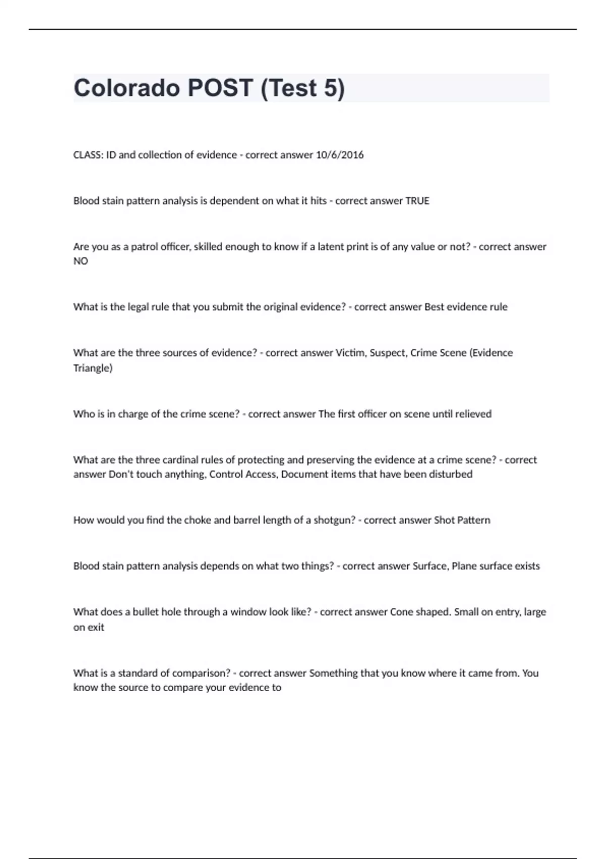 Colorado POST (Test 5)CLASS: ID and collection of evidence - correct answer 10/6/2016 Blood stain pattern analysis is dependent on what it hits - correct answer TRUE Are you as a patrol officer, skilled enough to know if a latent print is of any value or not? - correct answer NO What is the legal rule that you submit the original evidence? - correct answer Best evidence rule What are the three sources of evidence? - correct answer Victim, Suspect, Crime Scene (Evidence Triangle) Who is in charge of the crime scene? - correct answer The first officer on scene until relieved What are the three cardinal rules of protecting and preserving the evidence at a crime scene? - correct answer Don't touch anything, Control Access, Document items that have been disturbed How would you find the choke and barrel length of a shotgun? - correct answer Shot Pattern Blood stain pattern analysis depends on what two things? - correct answer Surface, Plane surface exists What does a bullet hole through a window look like? - correct answer Cone shaped. Small on entry, large on exit What is a standard of comparison? - correct answer Something that you know where it came from. You know the source to compare your evidence to