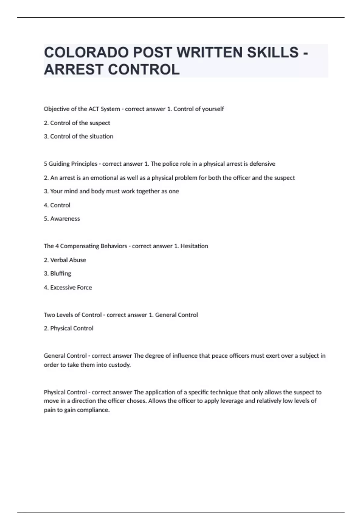 COLORADO POST WRITTEN SKILLS - ARREST CONTROLObjective of the ACT System - correct answer 1. Control of yourself 2. Control of the suspect 3. Control of the situation 5 Guiding Principles - correct answer 1. The police role in a physical arrest is defensive 2. An arrest is an emotional as well as a physical problem for both the officer and the suspect 3. Your mind and body must work together as one 4. Control 5. Awareness The 4 Compensating Behaviors - correct answer 1. Hesitation 2. Verbal Abuse 3. Bluffing 4. Excessive Force Two Levels of Control - correct answer 1. General Control 2. Physical Control General Control - correct answer The degree of influence that peace officers must exert over a subject in order to take them into custody. Physical Control - correct answer The application of a specific technique that only allows the suspect to move in a direction the officer choses. Allows the officer to apply leverage and relatively low levels of pain to gain compliance. 3 Types of Contacts - correct answer 1. Consensual 2. Reasonable Suspicion 3. Probable Cause Peace Officer Use of Force - 18-1-707 - correct answer Peace officer, in carrying out their duties, shall apply nonviolent means when possible, before resorting to the use of physical force. A peace officer may use physical force only if nonviolent means would prove ineffective in effecting an arrest, preventing escape, or preventing imminent threat of serious bodily injury or death to the peace officer or another. 3 Types of Force - correct answer 1. Controlling 2. Injuring 3. Deadly Excessive Force - 18-8-803 - correct answer Physical force which exceeds the degree of force pursuant to 18-1-707 in effecting an arrest or preventing an escape. Requirements For Peace Officers Who Witness Excessive Force - 18-8-802 - correct answer 1. A peace officer shall intervene to prevent or stop another from using excessive physical force 2. Must report to immediate supervisor AND provide a written report within 10 days 3 Types of Excessive Force - correct answer 1. Perceived 2. Unintentional 3. Intentional 6 Types of Resistance - correct answer 1. Psychological Intimidation 2. Verbal Resistance 3. Passive Resistance 4. Active Resistance 5. Active Aggression