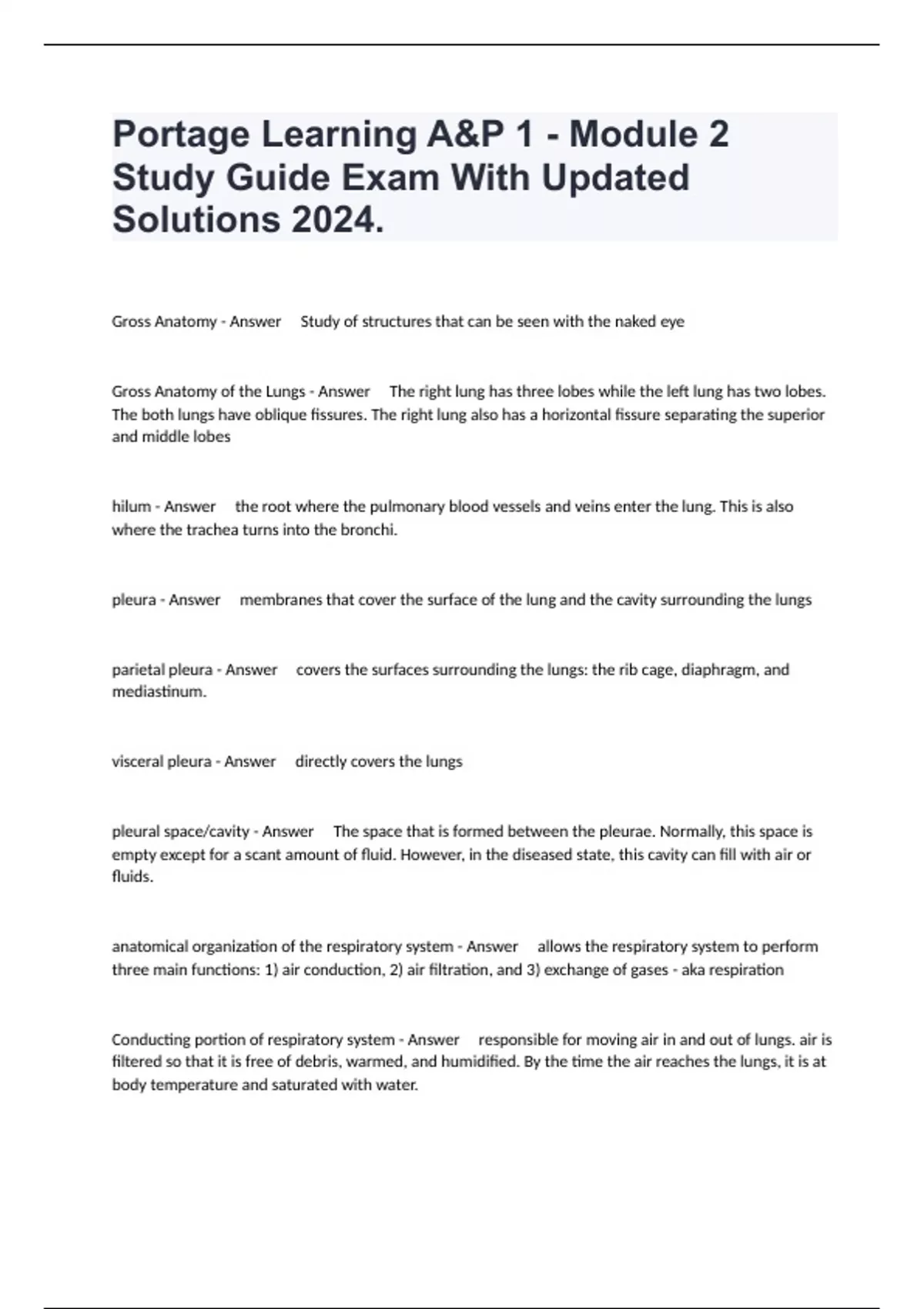 Gross Anatomy - Answer Study of structures that can be seen with the naked eye Gross Anatomy of the Lungs - Answer The right lung has three lobes while the left lung has two lobes. The both lungs have oblique fissures. The right lung also has a horizontal fissure separating the superior and middle lobes hilum - Answer the root where the pulmonary blood vessels and veins enter the lung. This is also where the trachea turns into the bronchi. pleura - Answer membranes that cover the surface of the lung and the cavity surrounding the lungs parietal pleura - Answer covers the surfaces surrounding the lungs: the rib cage, diaphragm, and mediastinum. visceral pleura - Answer directly covers the lungs pleural space/cavity - Answer The space that is formed between the pleurae. Normally, this space is empty except for a scant amount of fluid. However, in the diseased state, this cavity can fill with air or fluids. anatomical organization of the respiratory system - Answer allows the respiratory system to perform three main functions: 1) air conduction, 2) air filtration, and 3) exchange of gases - aka respiration Conducting portion of respiratory system - Answer responsible for moving air in and out of lungs. air is filtered so that it is free of debris, warmed, and humidified. By the time the air reaches the lungs, it is at body temperature and saturated with water.