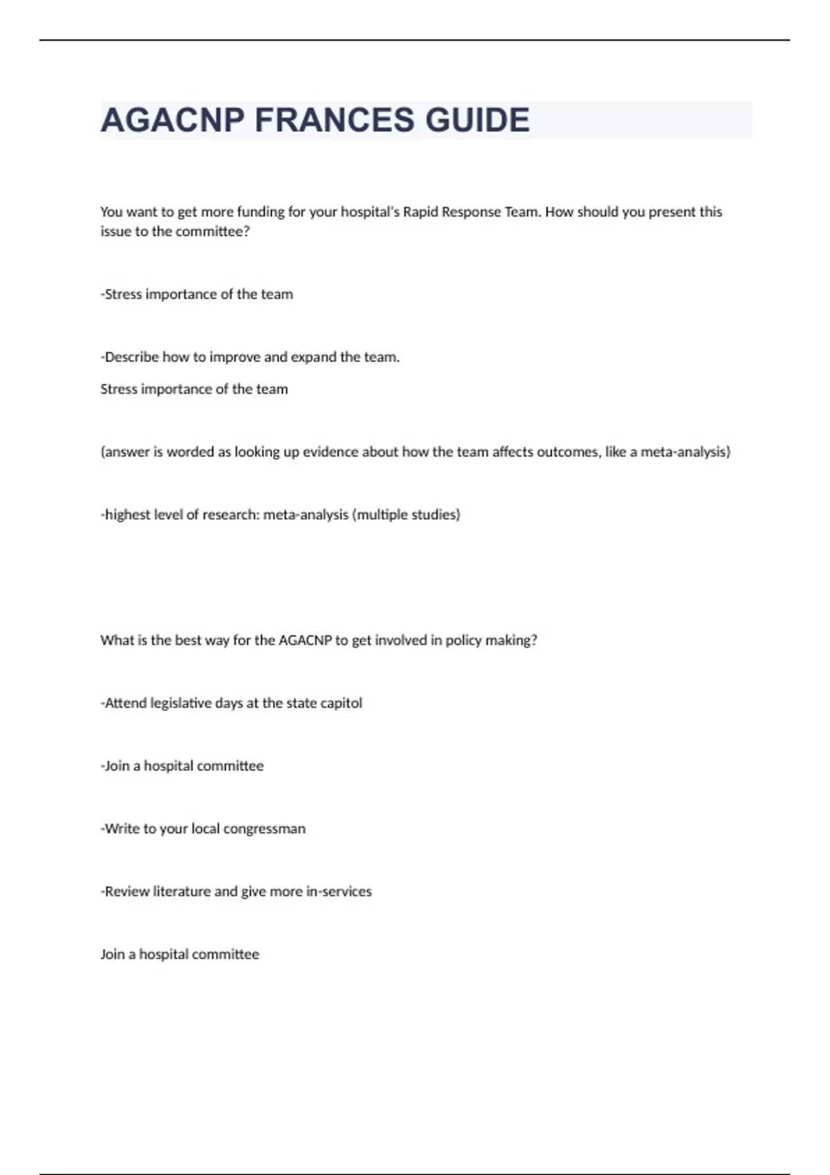 AGACNP FRANCES GUIDE QUESTIONS WITH COMPLETE ANSWERS 2024. You want to get more funding for your hospital's Rapid Response Team. How should you present this issue to the committee? -Stress importance of the team -Describe how to improve and expand the team. Stress importance of the team (answer is worded as looking up evidence about how the team affects outcomes, like a meta-analysis) -highest level of research: meta-analysis (multiple studies) What is the best way for the AGACNP to get involved in policy making? -Attend legislative days at the state capitol -Join a hospital committee -Write to your local congressman -Review literature and give more in-services Join a hospital committee