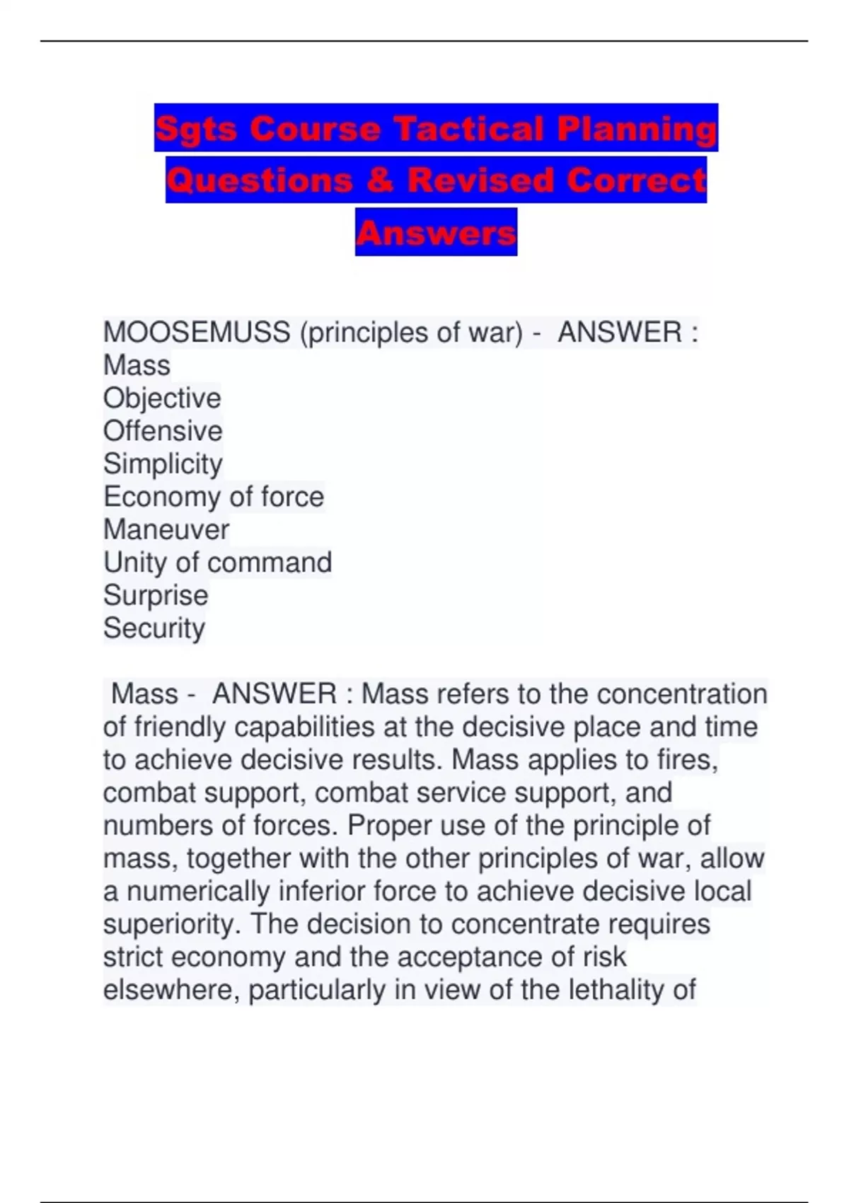 Sgts Course Tactical Planning Questions & Revised Correct Answers MOOSEMUSS (principles of war) - ANSWER : Mass Objective Offensive Simplicity Economy of force Maneuver Unity of command Surprise Security Mass - ANSWER : Mass refers to the concentration of friendly capabilities at the decisive place and time to achieve decisive results. Mass applies to fires, combat support, combat service support, and numbers of forces. Proper use of the principle of mass, together with the other principles of war, allow a numerically inferior force to achieve decisive local superiority. The decision to concentrate requires strict economy and the acceptance of risk elsewhere, particularly in view of the lethality of modern weapons that mandate the rapid assembly and speedy dispersal of forces.