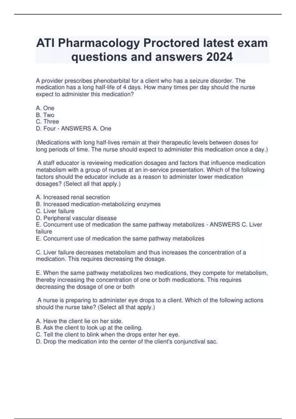 ATI Pharmacology Proctored latest exam questions and answers 2024 A provider prescribes phenobarbital for a client who has a seizure disorder. The medication has a long half-life of 4 days. How many times per day should the nurse expect to administer this medication? A. One B. Two C. Three D. Four - ANSWERS A. One (Medications with long half-lives remain at their therapeutic levels between doses for long periods of time. The nurse should expect to administer this medication once a day.) A staff educator is reviewing medication dosages and factors that influence medication metabolism with a group of nurses at an in-service presentation. Which of the following factors should the educator include as a reason to administer lower medication dosages? (Select all that apply.) A. Increased renal secretion B. Increased medication-metabolizing enzymes C. Liver failure D. Peripheral vascular disease E. Concurrent use of medication the same pathway metabolizes - ANSWERS C. Liver failure E. Concurrent use of medication the same pathway metabolizes C. Liver failure decreases metabolism and thus increases the concentration of a medication. This requires decreasing the dosage. E. When the same pathway metabolizes two medications, they compete for metabolism, thereby increasing the concentration of one or both medications. This requires decreasing the dosage of one or both A nurse is preparing to administer eye drops to a client. Which of the following actions should the nurse take? (Select all that apply.) A. Have the client lie on her side. B. Ask the client to look up at the ceiling. C. Tell the client to blink when the drops enter her eye. D. Drop the medication into the center of the client's conjunctival sac. E. Instruct the client to close her eye gently after instillation - ANSWERS B. Ask the client to look up at the ceiling. D. Drop the medication into the center of the client's conjunctival sac. E. Instruct the client to close her eye gently after instillation (B. The client should look upward to keep the drops from falling onto her cornea. D. The nurse should drop the medication into the center of the conjunctival sac to promote distribution. E. The client should close her eye gently to promote distribution of the medication) A nurse is completing discharge teaching for a client who has a new prescription for transdermal patches. Which of the following statements should the nurse identify as an indication that the client understands the instructions? A. "I will clean the site with an alcohol swab before I apply the patch." B. "I will rotate the application sites weekly." C. "I will apply the patch to an area of skin with no hair." D. "I will place the new patch on the site of the old patch. - ANSWERS C. "I will apply the patch to an area of skin with no hair." (The client should apply the patch to a hairless area of skin to promote absorption of the medication.) A nurse reviewing a client's medical record notes a new prescription for verifying the trough level of the client's medication. Which of the following actions should the nurse take? A. Obtain a blood specimen immediately prior to administering the next dose of medication. B. Verify that the client has been taking the medication for 24 hr before obtaining a blood specimen. C. Ask the client to provide a urine specimen after the next dose of medication. D. Administer the medication,and obtain a blood specimen 30 min late - ANSWERS A. Obtain a blood specimen immediately prior to administering the next dose of medication. (To verify trough levels of a medication, the nurse should obtain a blood specimen immediately before administering the next dose of medication.) A nurse is preparing a client's medications. Which of the following actions should the nurse take in following legal practice guidelines? (Select all that apply.) A. Maintain skill competency. B. Determine the dosage. C. Monitor for adverse effects. D. Safeguard medications. E. Identify the client's diagnosis - ANSWERS A. Maintain skill competency. C. Monitor for adverse effects. D. Safeguard medications. (A.maintaining skill competency and using appropriate administration techniques are legal responsibilities of the nurse C. A nurse is legally responsible for monitoring for side and adverse effects of medication D. Safeguarding of medications, such as controlled substances, is a legal responsibility of the nurse) A nurse reviewing a client's health record notes a new prescription for Lisinopril 10 mg PO once every day. The nurse should identify this as which of the following types of prescription?