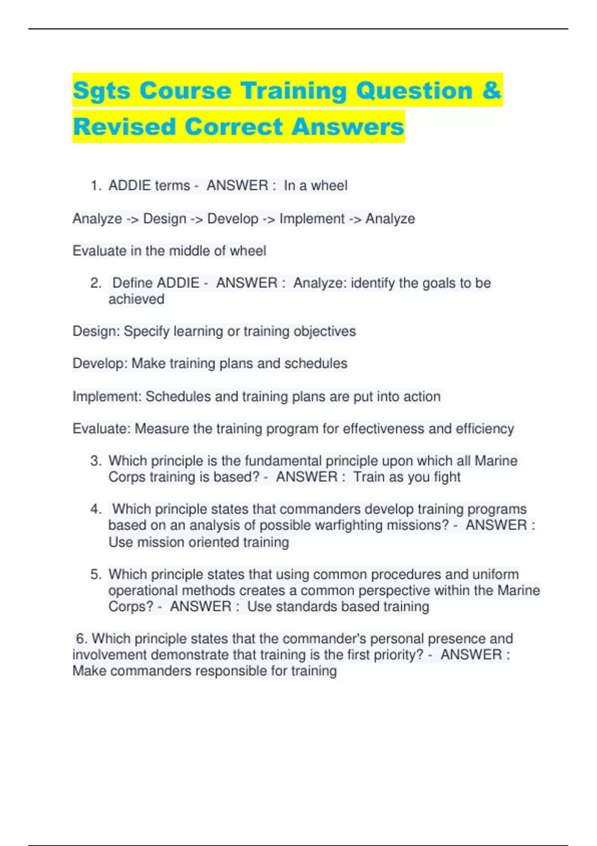 Sgts Course Training Question & Revised Correct Answers 1. ADDIE terms - ANSWER : In a wheel Analyze - Design - Develop - Implement - Analyze Evaluate in the middle of wheel 2. Define ADDIE - ANSWER : Analyze: identify the goals to be achieved Design: Specify learning or training objectives Develop: Make training plans and schedules Implement: Schedules and training plans are put into action Evaluate: Measure the training program for effectiveness and efficiency 3. Which principle is the fundamental principle upon which all Marine Corps training is based? - ANSWER : Train as you fight 4. Which principle states that commanders develop training programs based on an analysis of possible warfighting missions? - ANSWER : Use mission oriented training 5. Which principle states that using common procedures and uniform operational methods creates a common perspective within the Marine Corps? - ANSWER : Use standards based training
