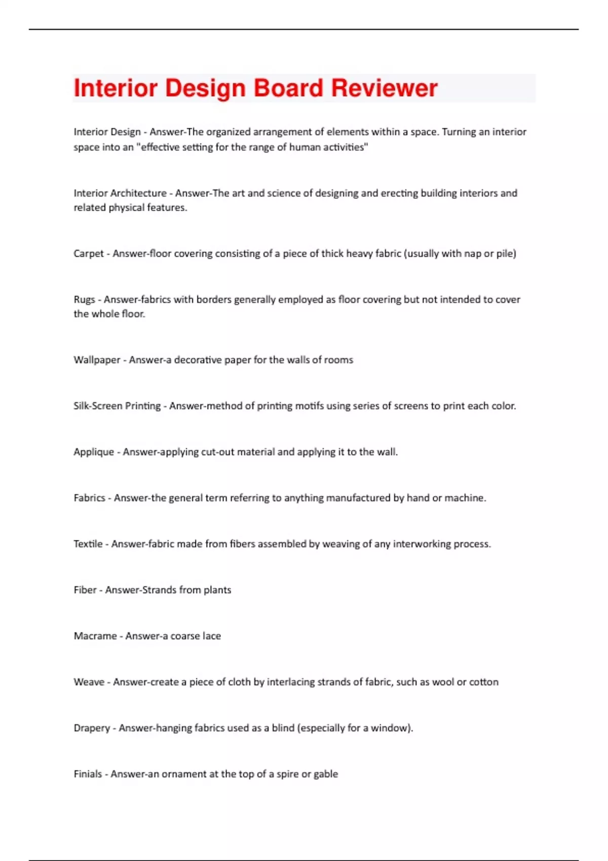 Interior Design - Answer-The organized arrangement of elements within a space. Turning an interior space into an "effective setting for the range of human activities" Interior Architecture - Answer-The art and science of designing and erecting building interiors and related physical features. Carpet - Answer-floor covering consisting of a piece of thick heavy fabric (usually with nap or pile) Rugs - Answer-fabrics with borders generally employed as floor covering but not intended to cover the whole floor. Wallpaper - Answer-a decorative paper for the walls of rooms Silk-Screen Printing - Answer-method of printing motifs using series of screens to print each color. Applique - Answer-applying cut-out material and applying it to the wall. Fabrics - Answer-the general term referring to anything manufactured by hand or machine. Textile - Answer-fabric made from fibers assembled by weaving of any interworking process. Fiber - Answer-Strands from plants Macrame - Answer-a coarse lace Weave - Answer-create a piece of cloth by interlacing strands of fabric, such as wool or cotton Drapery - Answer-hanging fabrics used as a blind (especially for a window). Finials - Answer-an ornament at the top of a spire or gableWindow - Answer-a framework of wood or metal that contains a glass windowpane and is built into a wall or roof to admit light or air Floor - Answer-The level base surface of a room or a defined space upon which one stands or walks on. Floor Termination - Answer-FLOOR ELEMENTS THAT AESTHETICALLY AND FUNCTIONALLY IMPROVE THE EDGE OF INSTALLATION OF A FLOOR FINISH Floor Transistion - Answer-FLOOR ELEMENTS THAT AESTHETICALLY AND FUNCTIONALLY IMPROVE THE JOINTS BETWEEN FINISHES Door - Answer-an opening/closing structure used to block off an entrance, typically consisting of an interior side that faces the inside of a space and an exterior side that faces the outside of that space. Hinge - Answer-a joint that holds two parts together so that one can swing relative to the other Jamb - Answer-upright consisting of a vertical side member of a door or window frame Skylight - Answer-a window in a roof to admit daylight Fiberglass - Answer-a covering material made of glass fibers in resins Vinyl - Answer-shiny and tough and flexible plastic Wall - Answer-an embankment built around a space for defensive purposes Moulding - Answer-a decorative recessed or relieved surface on an edge Chinese furniture - Answer-total absence of nails Baliwag furniture - Answer-turned legs with strechers. Narra, carabao inlay, canedBatangas furniture - Answer-Chinese influence, tindalo wood Ilocos furniture - Answer-Gallinera influence Philip Starck - Answer-created Glow chairs Arne Jacobsen - Answer-created Swan Chair & Sofe
