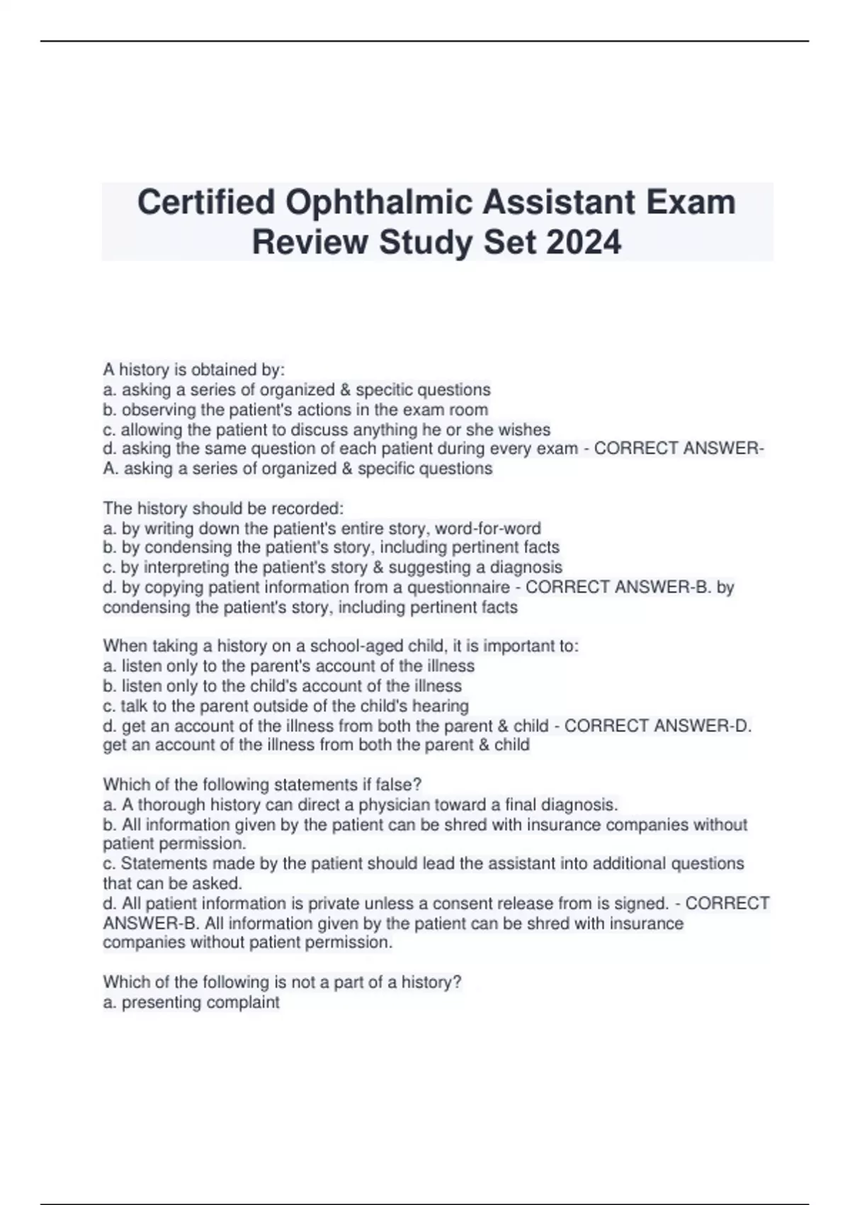 Certified Ophthalmic Assistant Exam Review Study Set 2024 A history is obtained by: a. asking a series of organized & specitic questions b. observing the patient's actions in the exam room c. allowing the patient to discuss anything he or she wishes d. asking the same question of each patient during every exam - CORRECT ANSWERA. asking a series of organized & specific questions The history should be recorded: a. by writing down the patient's entire story, word-for-word b. by condensing the patient's story, including pertinent facts c. by interpreting the patient's story & suggesting a diagnosis d. by copying patient information from a questionnaire - CORRECT ANSWER-B. by condensing the patient's story, including pertinent facts When taking a history on a school-aged child, it is important to: a. listen only to the parent's account of the illness b. listen only to the child's account of the illness c. talk to the parent outside of the child's hearing d. get an account of the illness from both the parent & child - CORRECT ANSWER-D. get an account of the illness from both the parent & child Which of the following statements if false? a. A thorough history can direct a physician toward a final diagnosis. b. All information given by the patient can be shred with insurance companies without patient permission. c. Statements made by the patient should lead the assistant into additional questions that can be asked. d. All patient information is private unless a consent release from is signed. - CORRECT ANSWER-B. All information given by the patient can be shred with insurance companies without patient permission. Which of the following is not a part of a history? a. presenting complaint b. medications currently used c. family eye disease d. visual acuity - CORRECT ANSWER-D. visual acuity The "presenting complaint" is: a. the main reason that the patient has come to the office b. always the most serious of the patient's many complaints c. the only item with which the history is really concerned d. the main reason the patient should be dilated - CORRECT ANSWER-A. the main reason that the patient has come to the office An example of a question relating to onset would be: a. "Can you still function at work?" b. "When did you first notice the problem?" c. "What treatment have you tried?" d. "Has the problem worsened?" - CORRECT ANSWER-B. "When did you first notice the problem?"